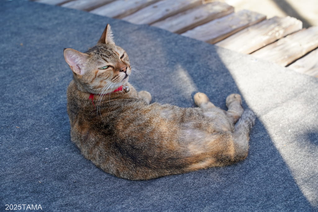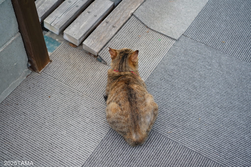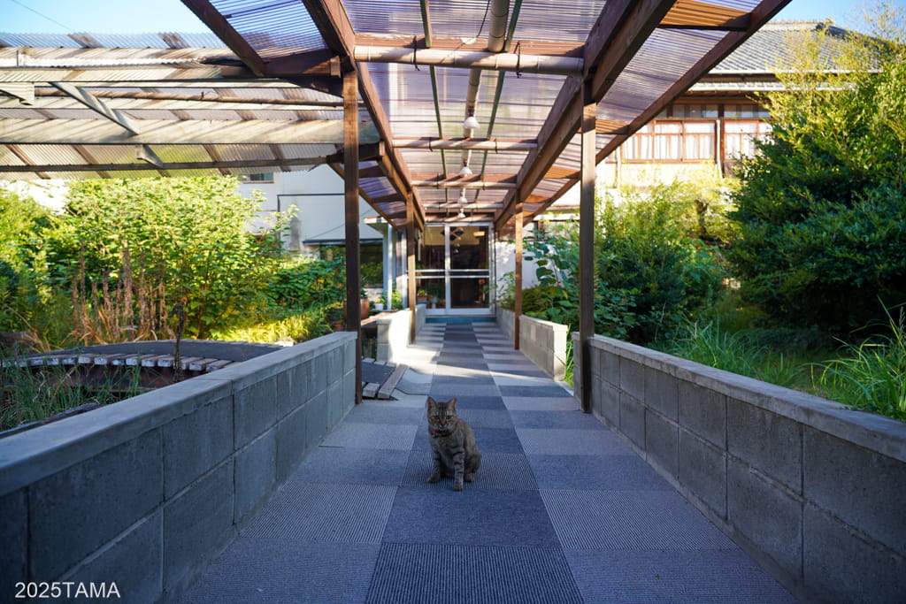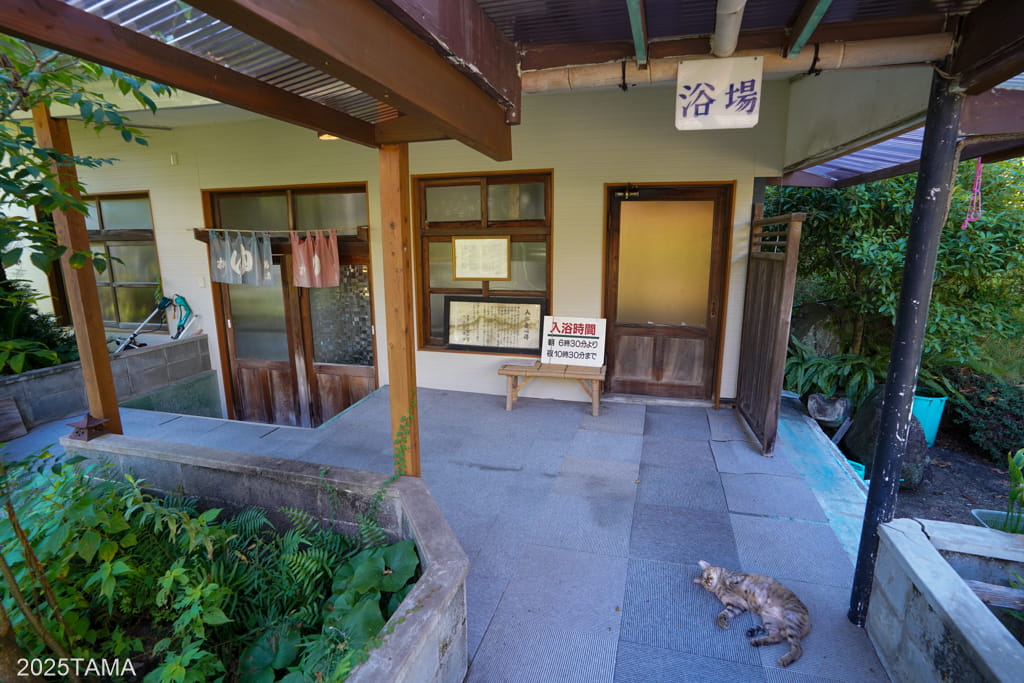 今まで出てきた写真にもすでに載っていた通り、猫のヒナちゃんはとても人懐っこいです。主に温泉へ続く屋外の通路に座っていて、自分がそこを通ろうとするとスリスリしてきます。