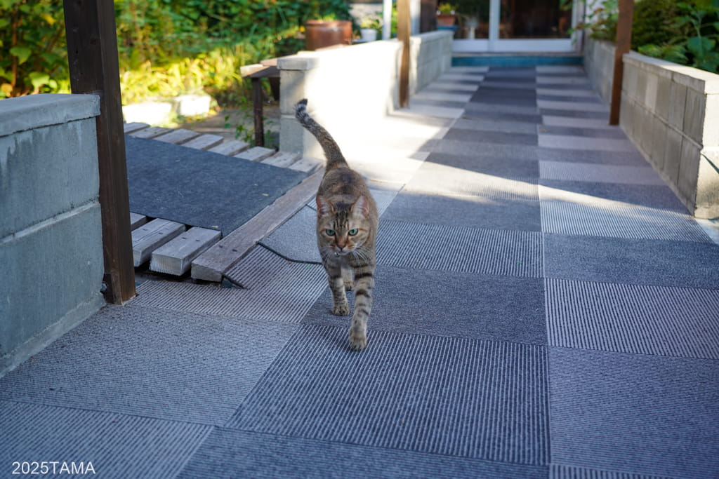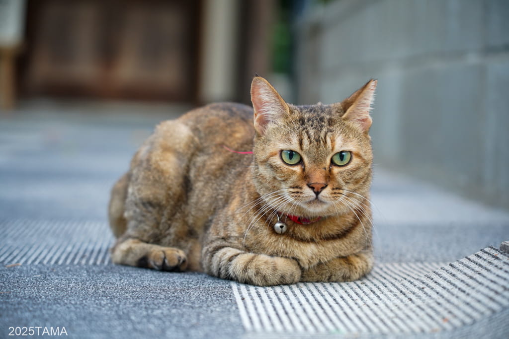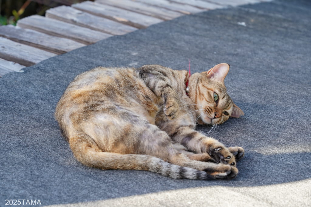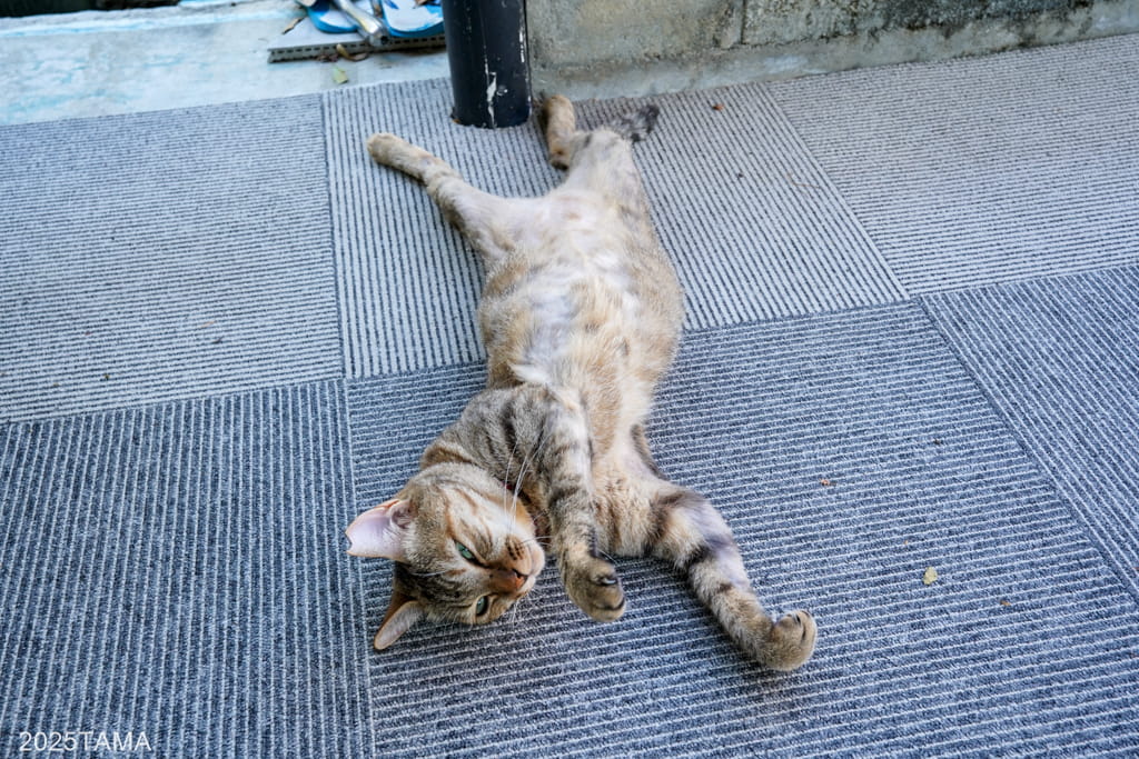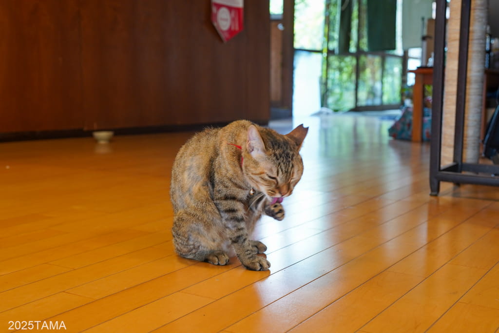 今まで出てきた写真にもすでに載っていた通り、猫のヒナちゃんはとても人懐っこいです。主に温泉へ続く屋外の通路に座っていて、自分がそこを通ろうとするとスリスリしてきます。
