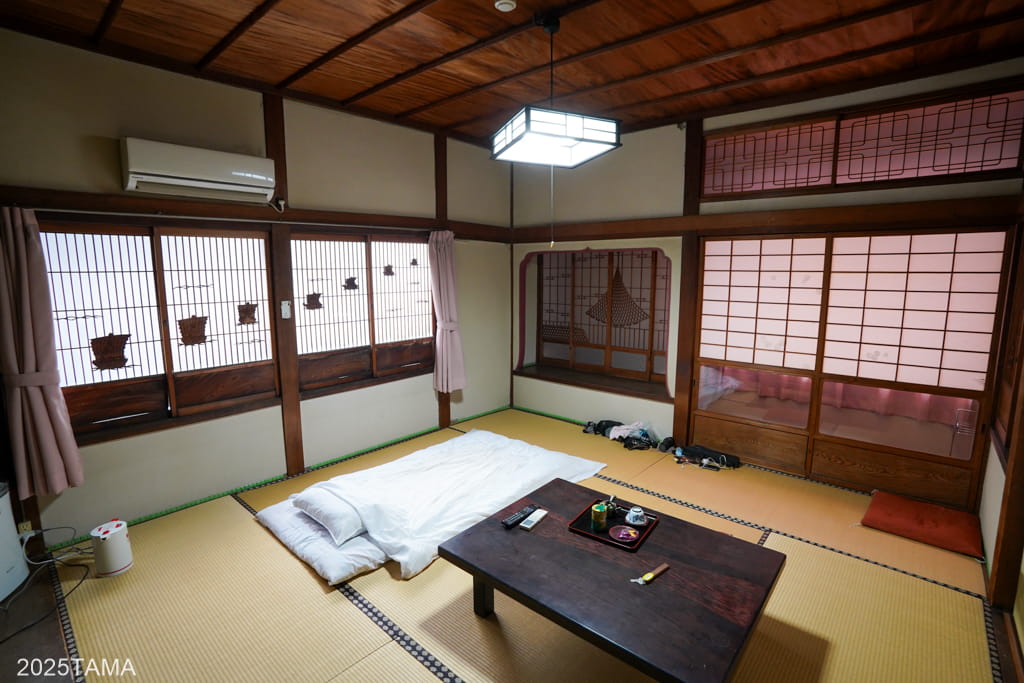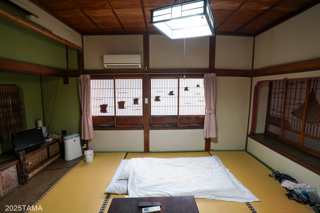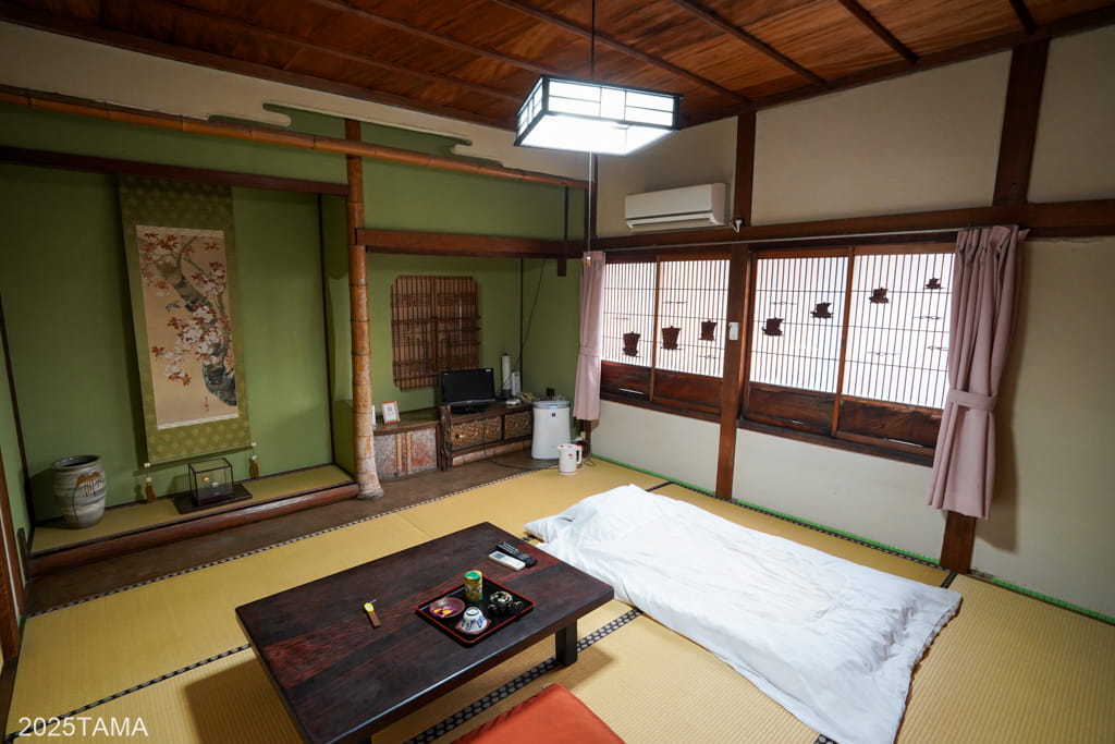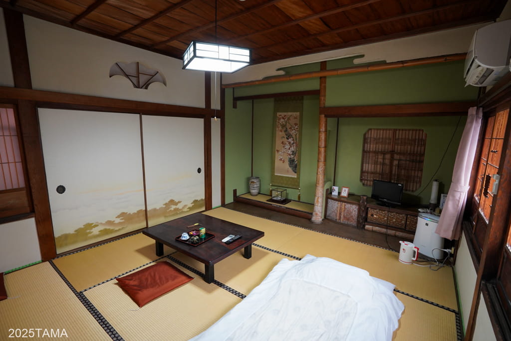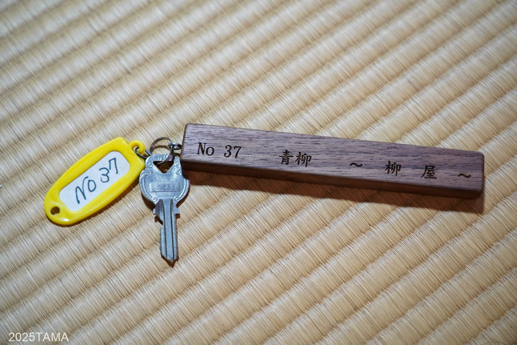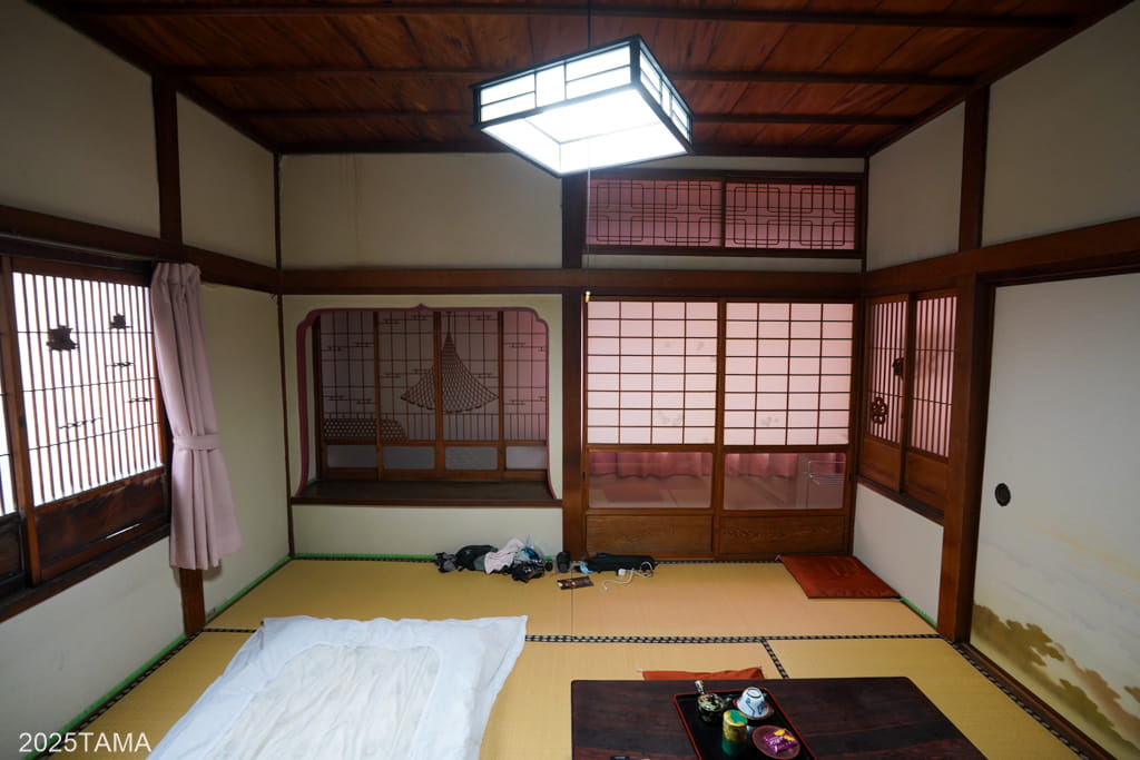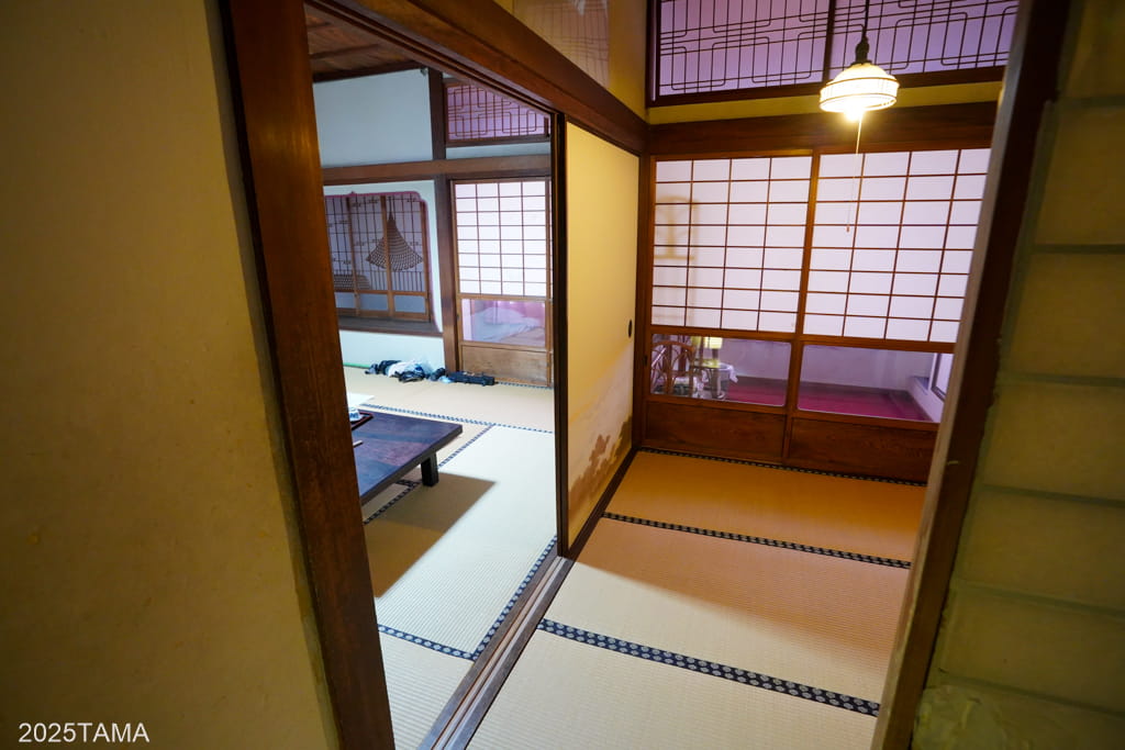 泊まったのは古いエリアに入って一番手前側の「青柳」の部屋で、踏込・次の間3畳・本間8畳から構成されています。場所的には表通りから見える「柳屋」の看板のすぐ左側。さらに次の間の奥には洗面所とトイレがある別のスペースが設けられており、ちょっとしたことで部屋を出入りする必要はありません。