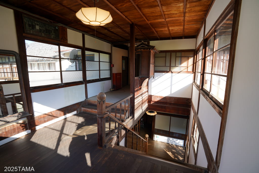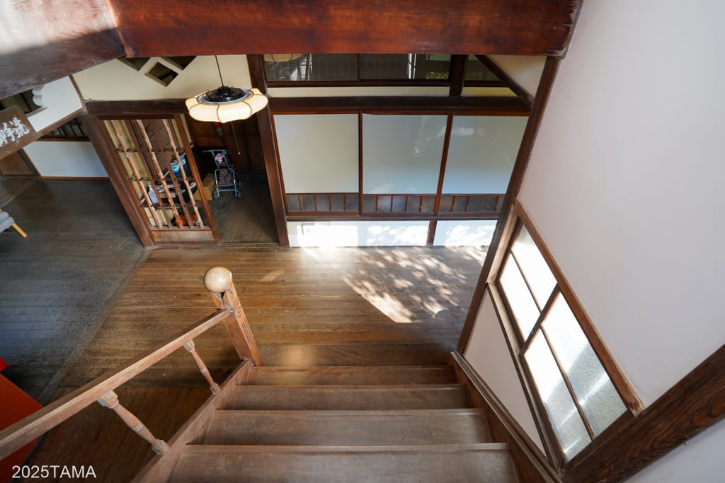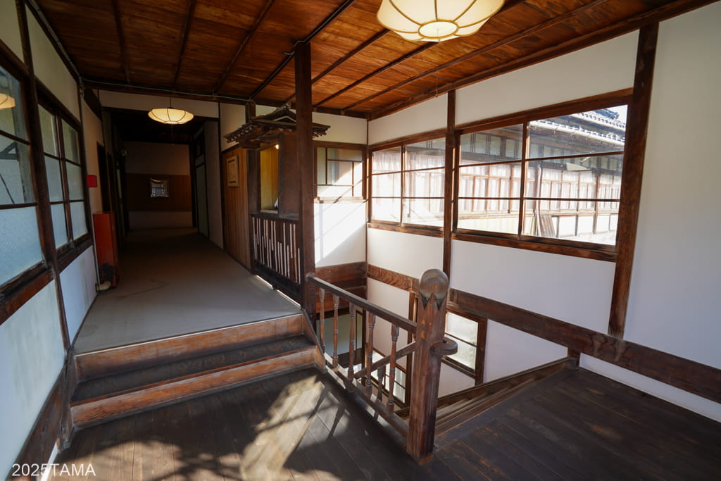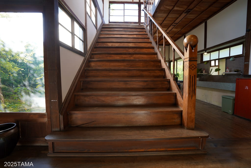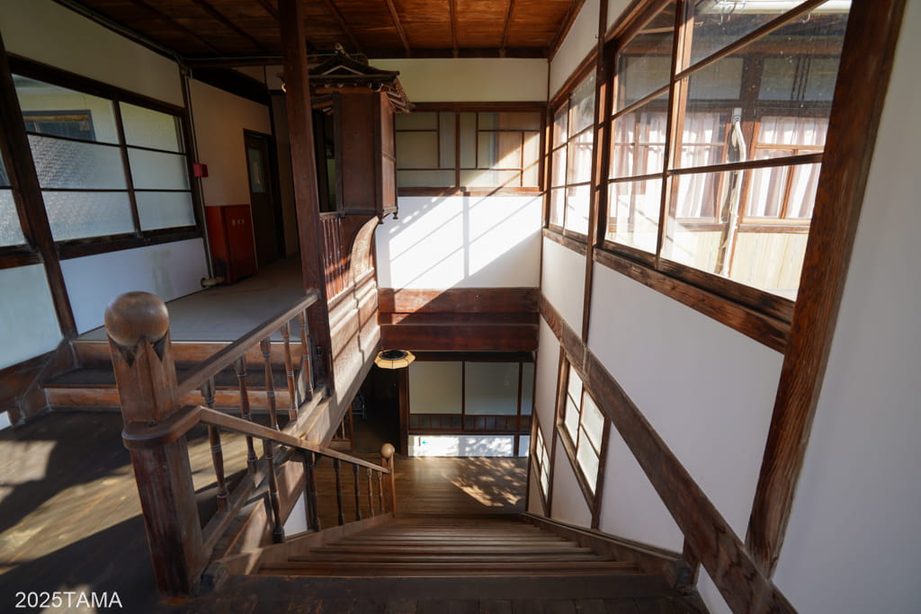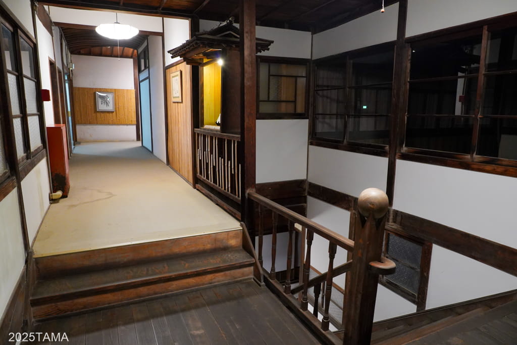 社を過ぎると1段の階段を挟んで広々とした踊り場。廊下と階段部分はスペースが広くとってあり、廊下や階段の幅が広くて窓も大きい。すべて木造だが中庭側は窓が多く明るい雰囲気が漂っています。