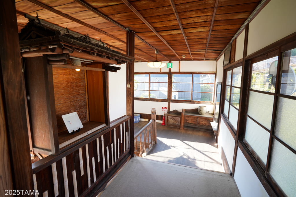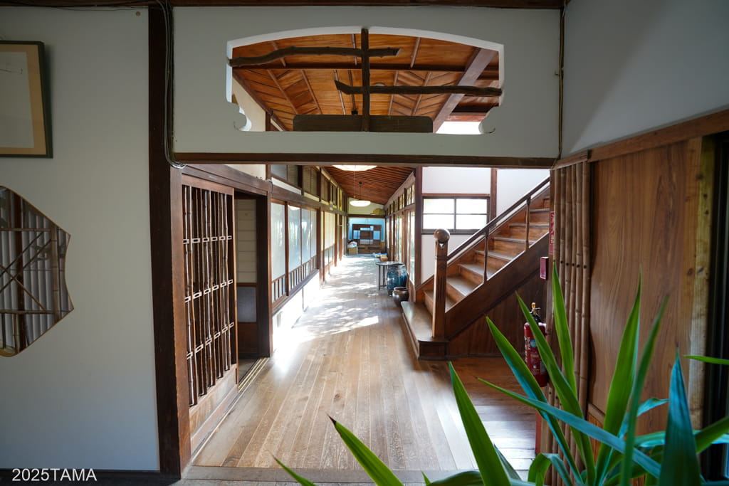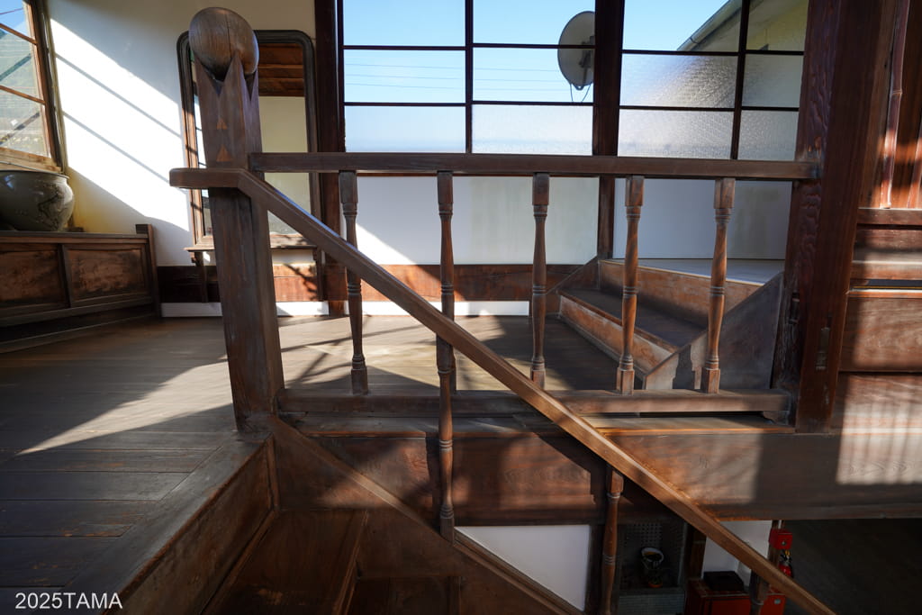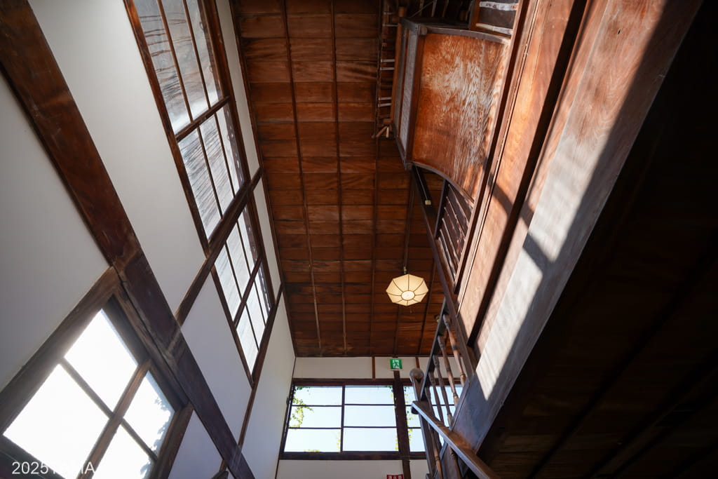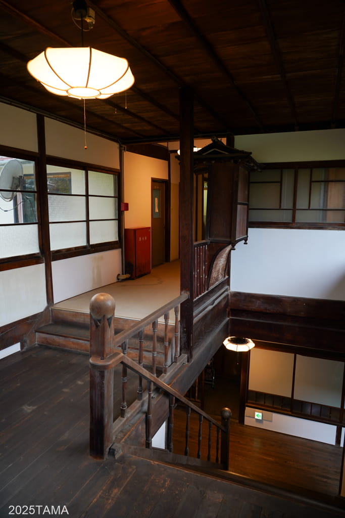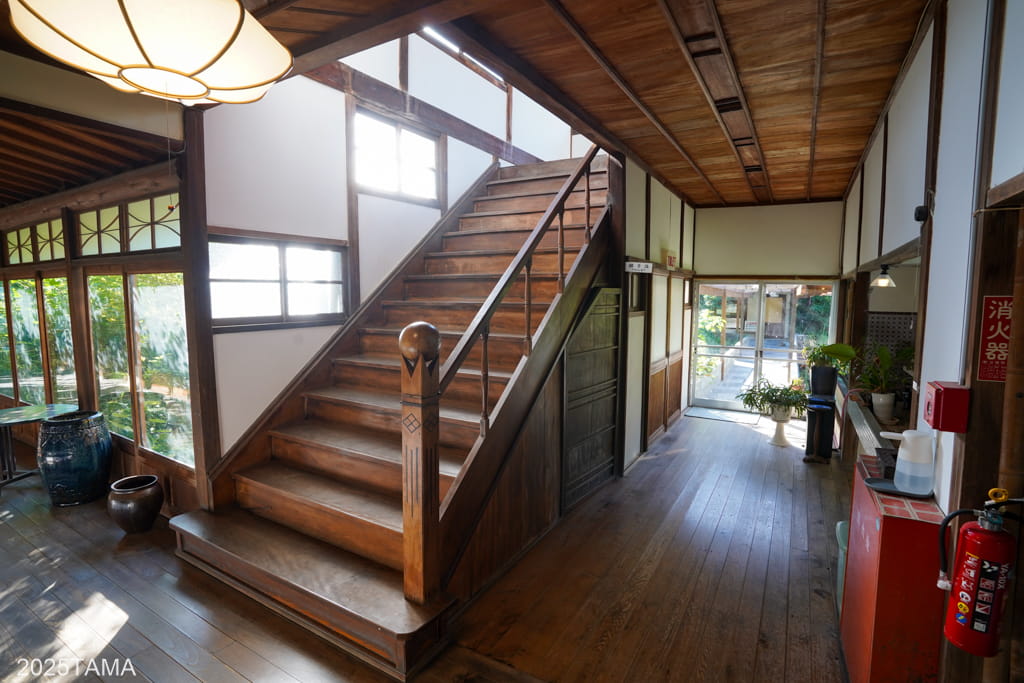社を過ぎると1段の階段を挟んで広々とした踊り場。廊下と階段部分はスペースが広くとってあり、廊下や階段の幅が広くて窓も大きい。すべて木造だが中庭側は窓が多く明るい雰囲気が漂っています。