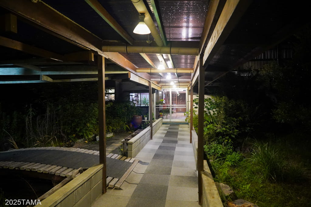 温泉は本館や別館から離れた別棟に存在し、中央階段横の出入り口から中庭に設けられた屋根付きの通路を通って向かう形となります。雨でも濡れることはないものの、屋外を通過することになるので夏場は蚊に刺されやすいです(実際に刺された人)。
