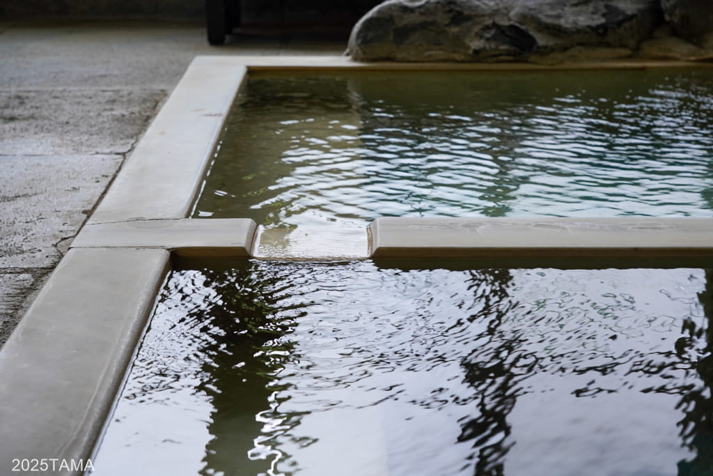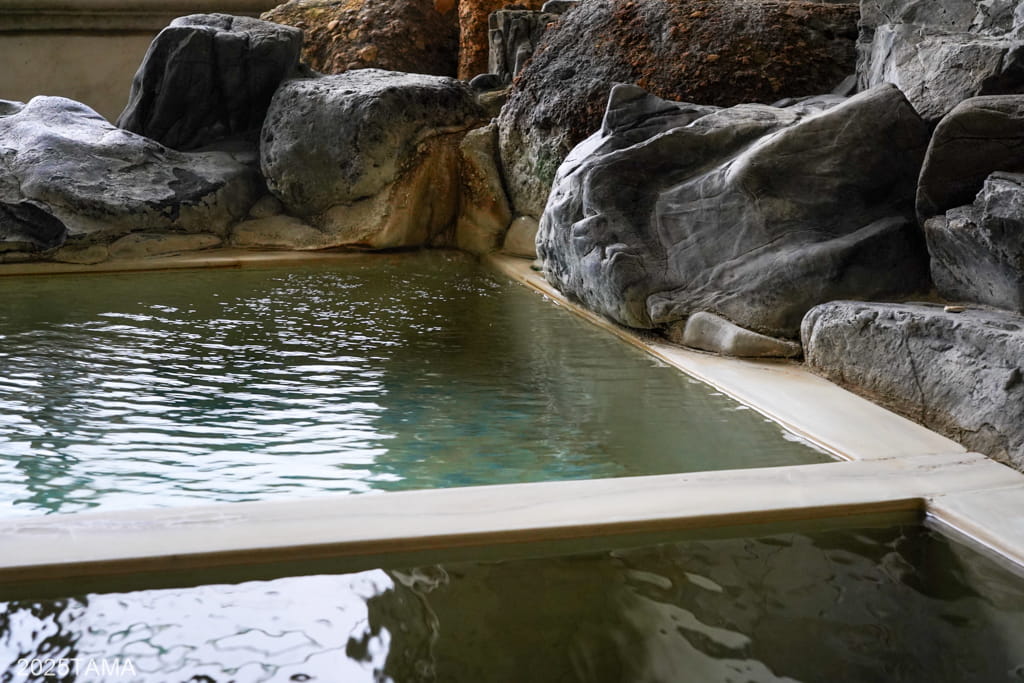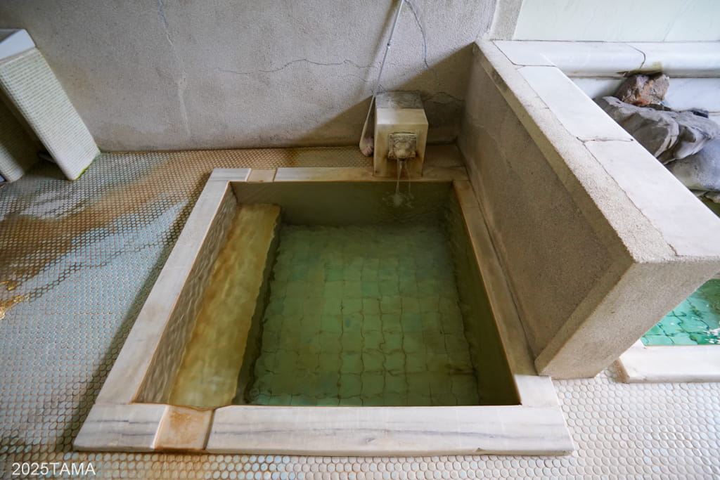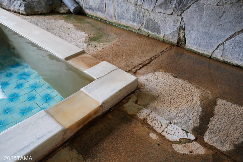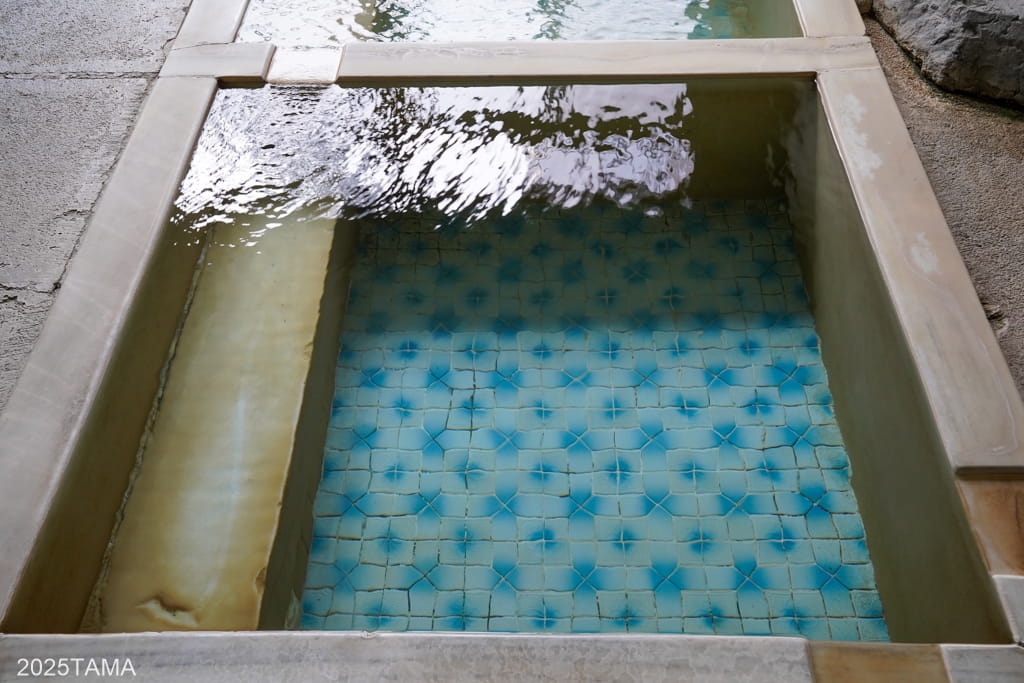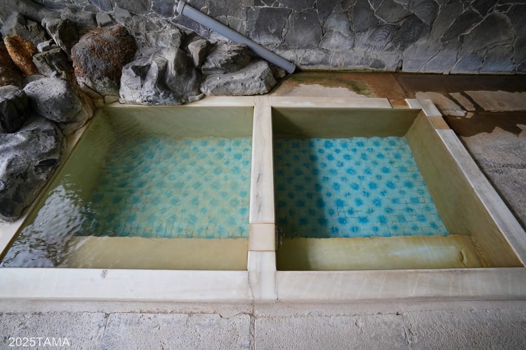 「浴槽が2箇所あって、上流側~下流側~床の順で湯が流れていく構造」は日奈久温泉の他の複数の施設でも見かけたため、どうやら日奈久温泉に共通する要素のようです。大人数が入れる浴槽を一つ設けるのではなく、ほどほどの大きさの湯船を2つ設けることによって湯の新鮮さを保つ狙いがあるみたい。