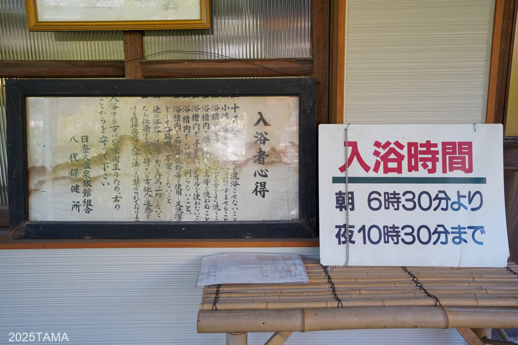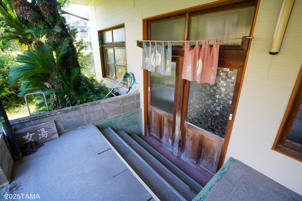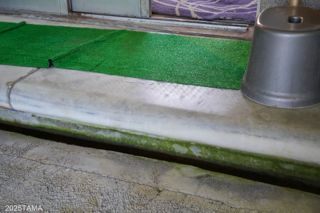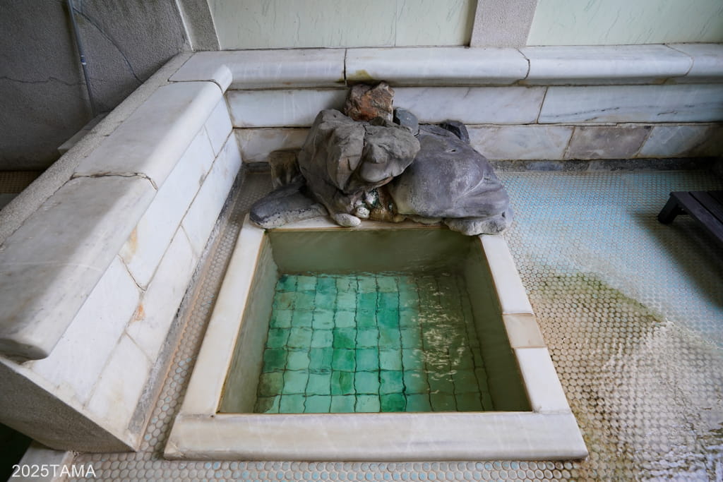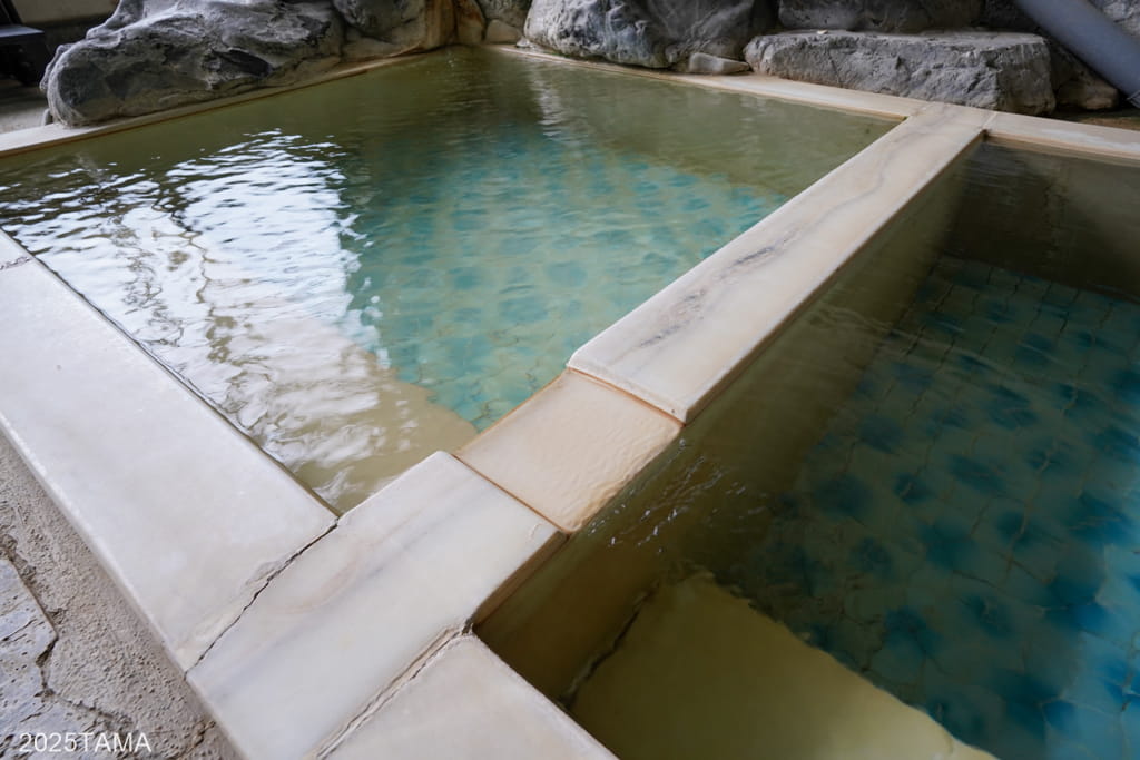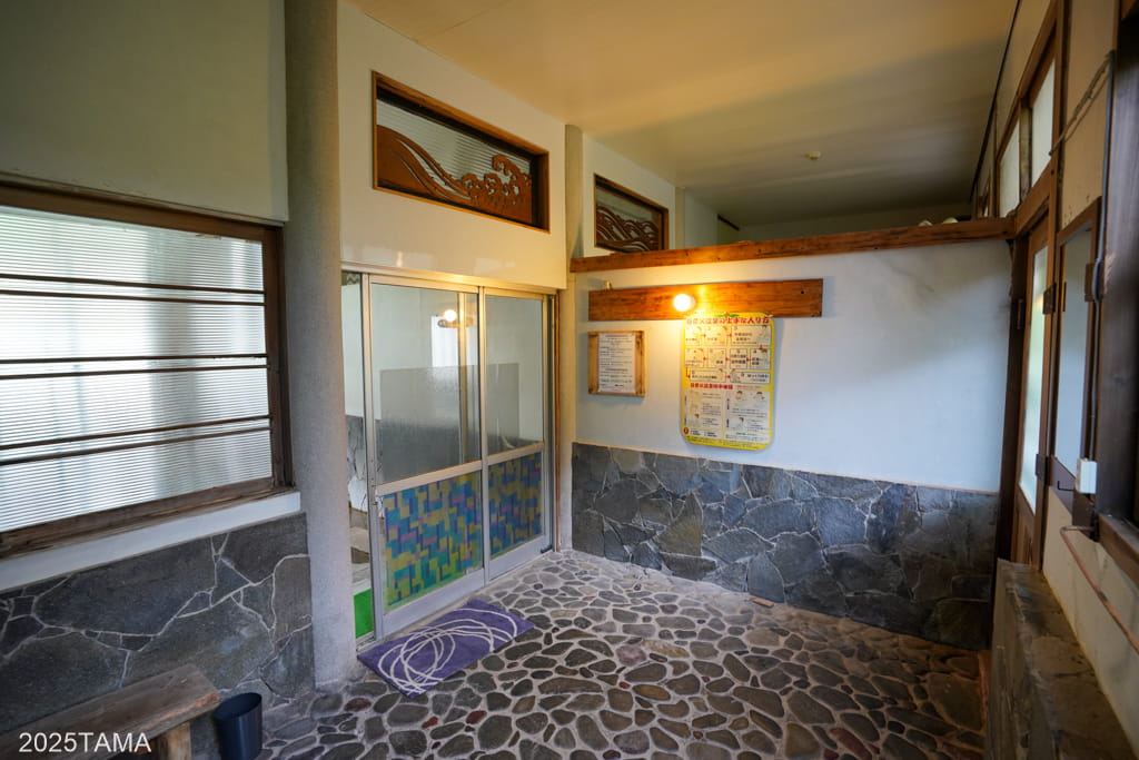 「浴槽が2箇所あって、上流側~下流側~床の順で湯が流れていく構造」は日奈久温泉の他の複数の施設でも見かけたため、どうやら日奈久温泉に共通する要素のようです。大人数が入れる浴槽を一つ設けるのではなく、ほどほどの大きさの湯船を2つ設けることによって湯の新鮮さを保つ狙いがあるみたい。