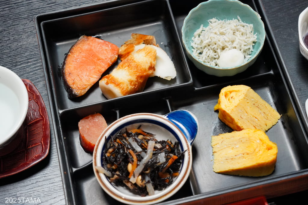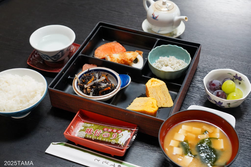 ご飯に味噌汁、ひじきの煮物、日奈久ならではの竹輪、鮭、卵焼き、しらす、味海苔、ぶどう等が出ました。ご飯がおかわり自由ということもあってあっという間に完食。朝風呂後で空腹になった身体に柳屋旅館の朝食がスッと染み渡っていく。