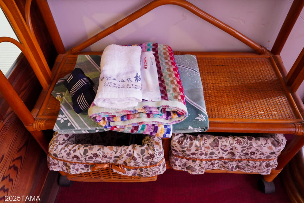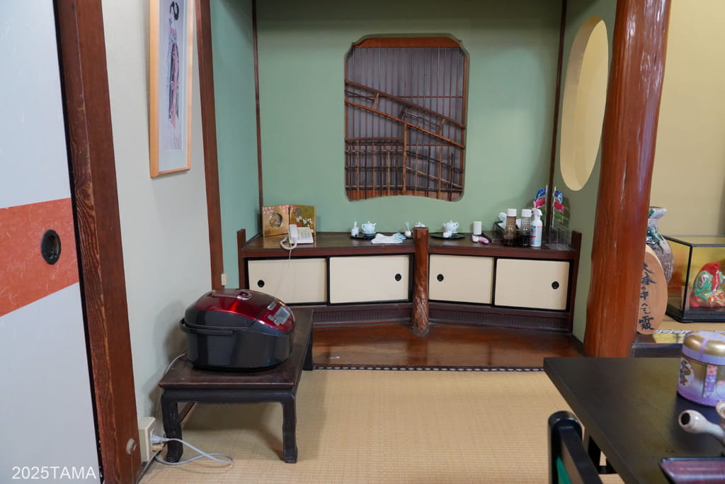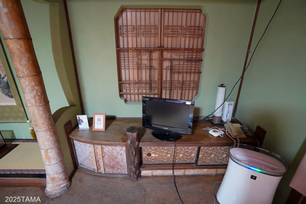 設備はエアコン、空気清浄機、ポット、テレビ、内線。アメニティは浴衣、タオル、バスタオル、歯ブラシあり。また窓際の広縁のようなスペースには椅子や机はないものの、洗面所、ウォシュレット付きのトイレ、着物掛けや姿見などがあって憂う点はありません。