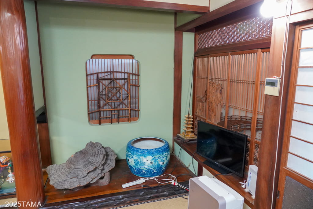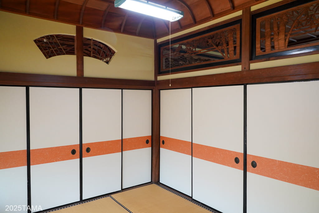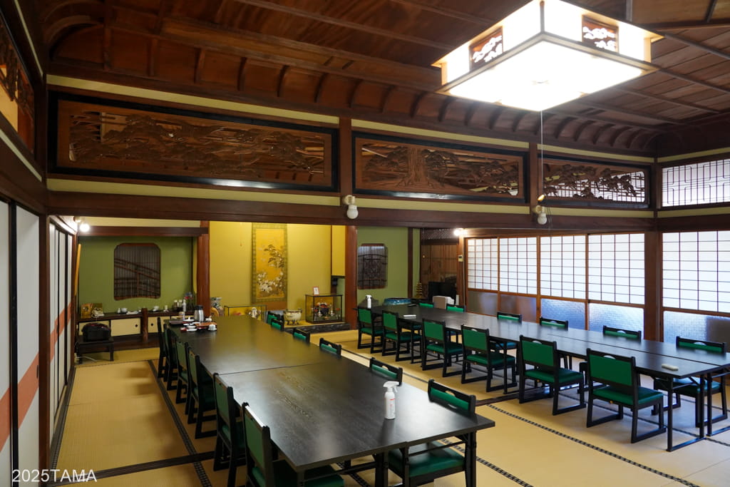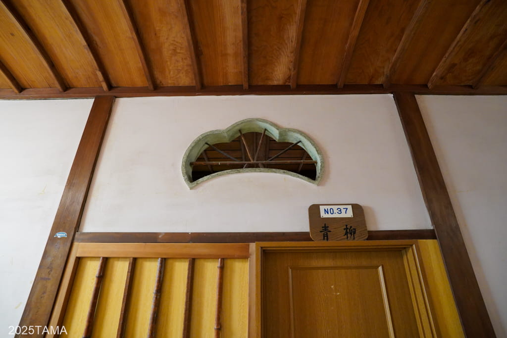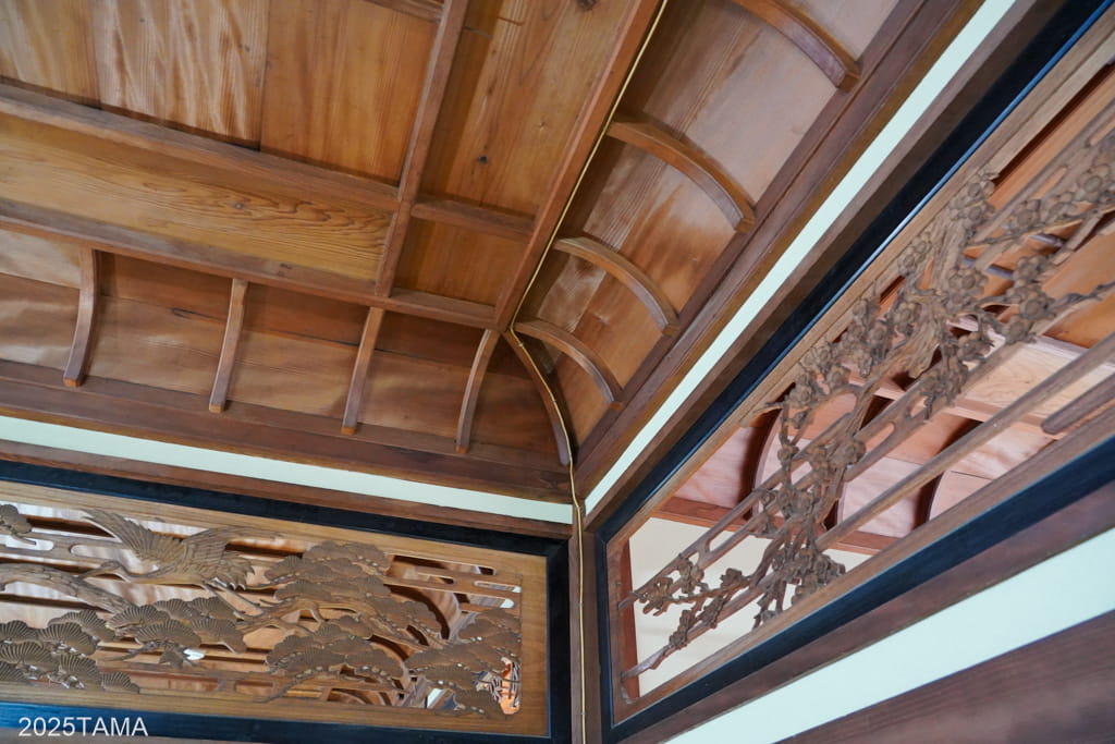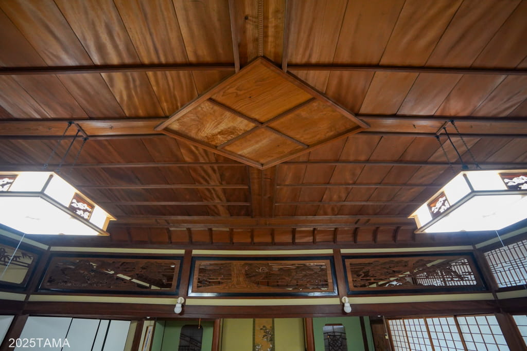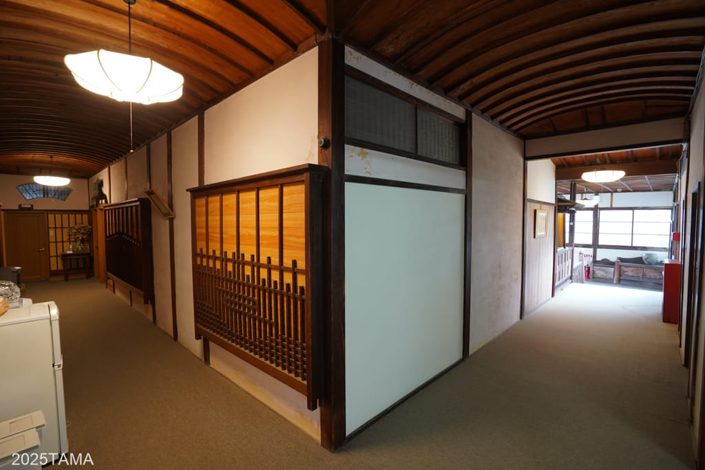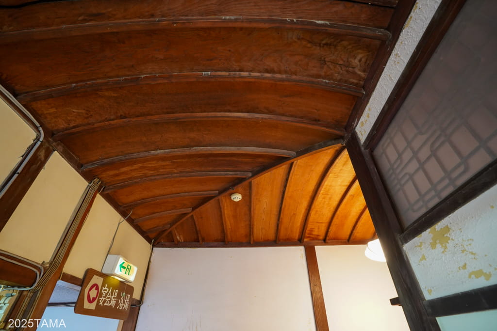 天井と壁との境目が直角ではなく丸みを帯びたリブと板で構成されていたり(お寺でよく見る造り)、絵柄が見事なたくさんの欄間、さらには天井には菱形の図形が形作られていたり。当時の大工職人が凝ったであろう箇所を眺めていると日奈久温泉の繁栄ぶりがよく理解できる。