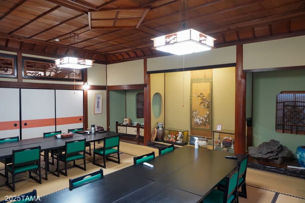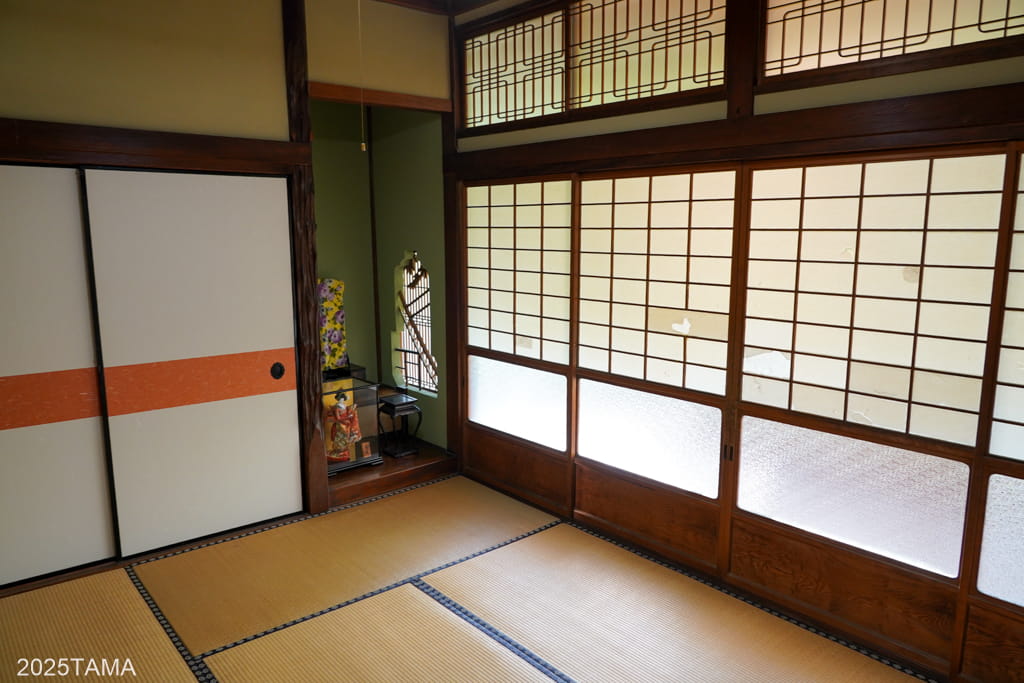 通常の1.5倍ほどある大きな襖戸を開けた先の本間は床の間や付書院、そして付書院横の窓が設けられているなど全体的に豪華な造り。部屋の2面が屋外に面しているので照明を付けなくても自然光だけで明るいです。