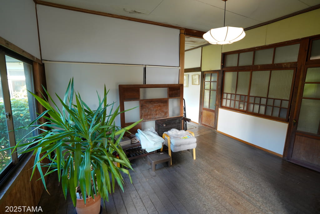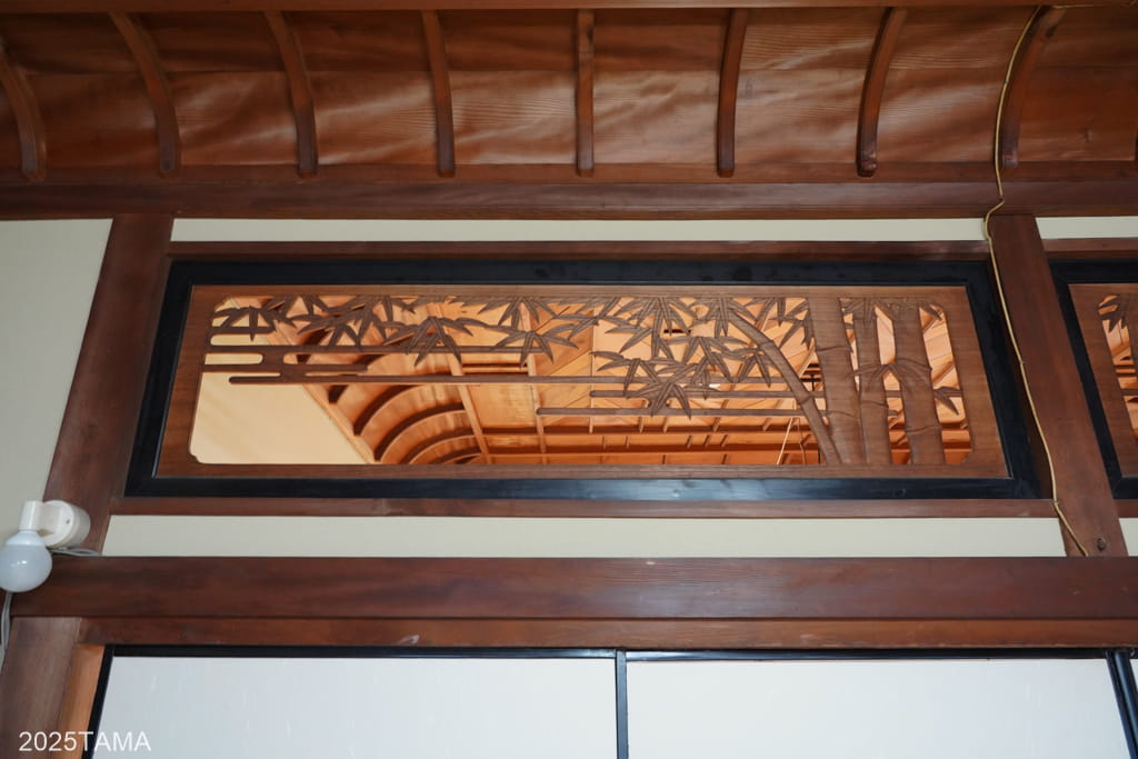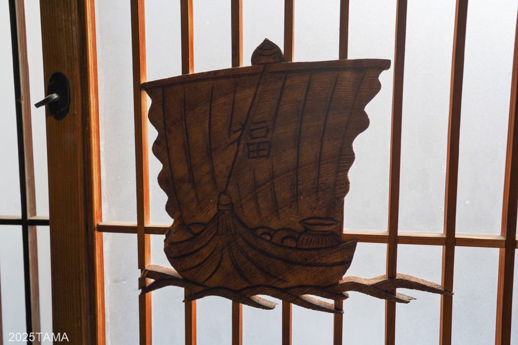 本間の飾り障子(今はガラスに置き換わっている)には宝船がデザインされていました。これも確証はないけど昭和ならではの意匠な気がします。なおこの障子戸を開けたら網戸なしですぐ屋外になっていて、開けっ放しにするのはやめました。