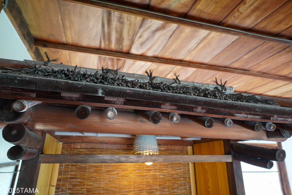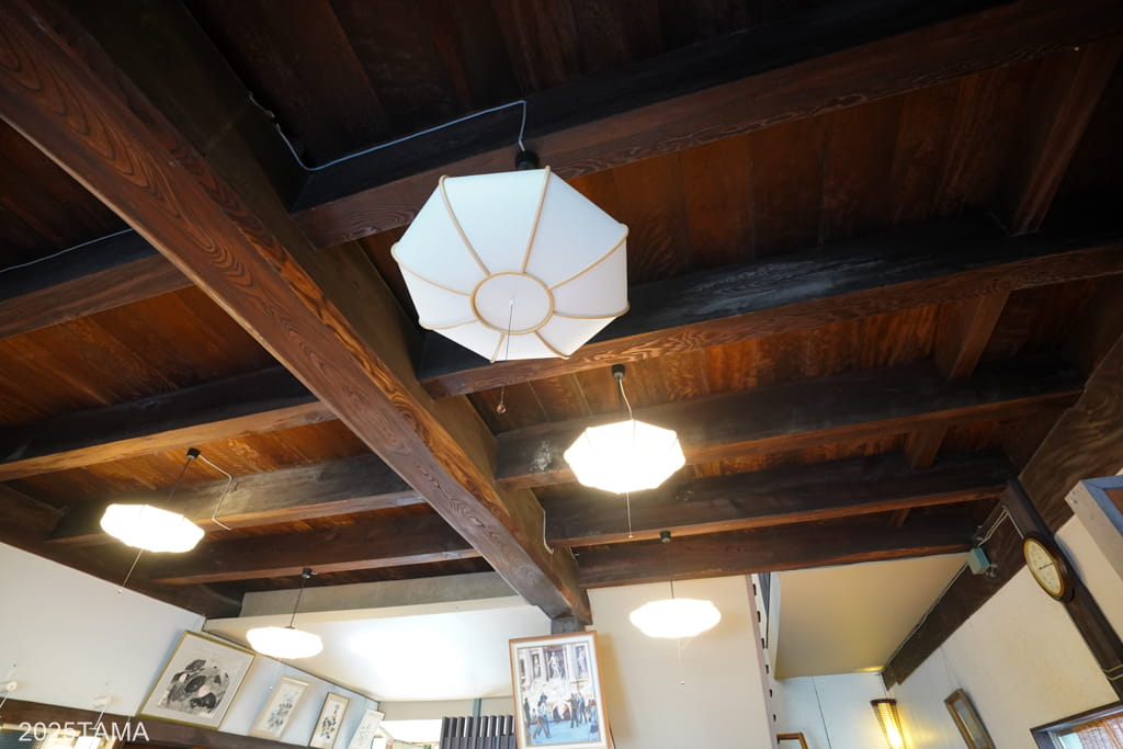 天井の太い梁や天井板は創業当時から残るもので、他の木材と比較すると色がかなり濃いです。強度部材がここまで露わになっているとしっかり荷重を支えてくれそうで安心できます。