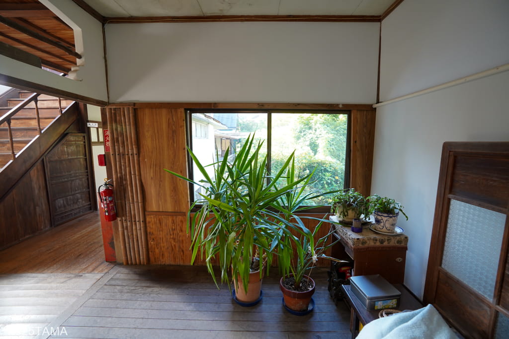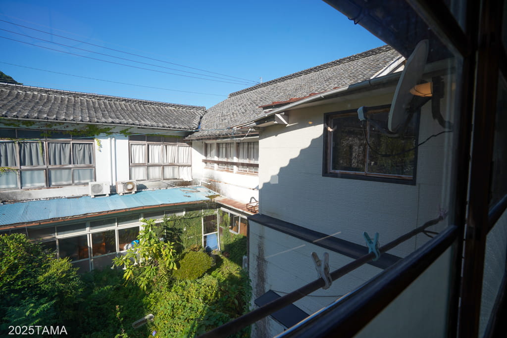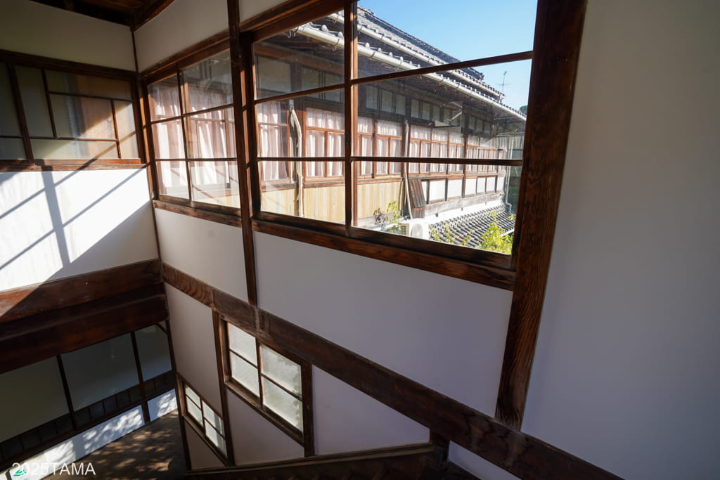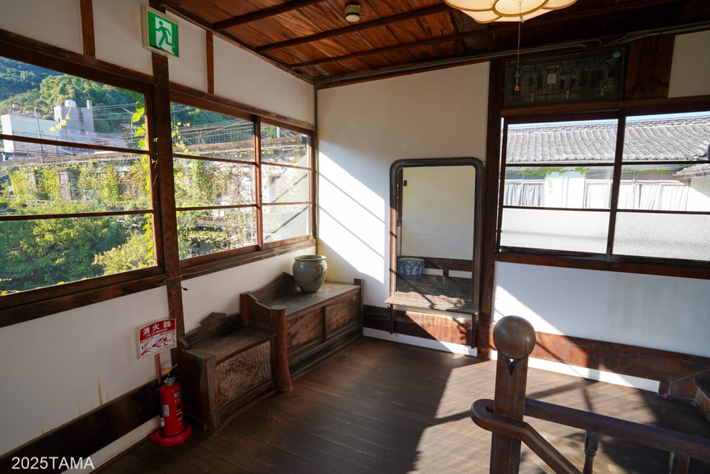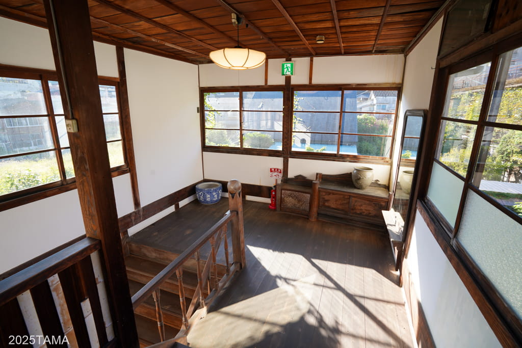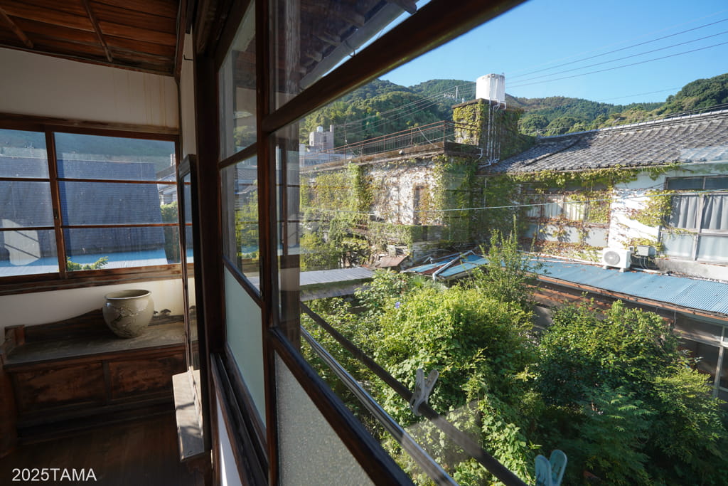 この窓からは本館左側の部分を裏側から眺めることができ、つまりこの踊り場からは柳屋旅館のほぼ全域を見渡すことが可能。宿泊する建物だけではなく温泉や中庭、そしてそこを歩く人々の様子まで見えるというわけです。