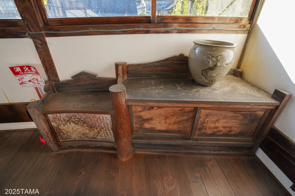 踊り場右端には、まるで客室の床の間の一部のような意匠が見られました。用途はよく分かりませんが、花瓶などを展示する際の台として造られたようです。