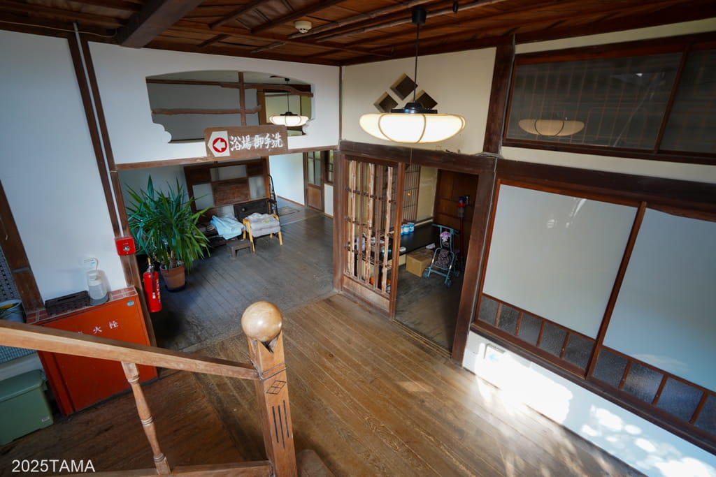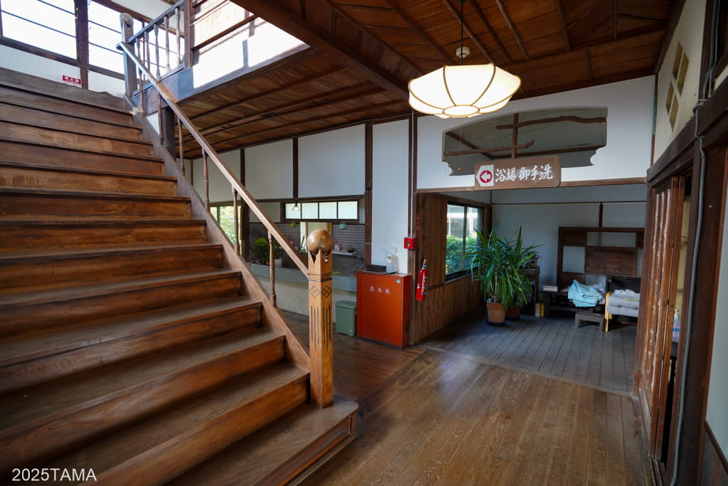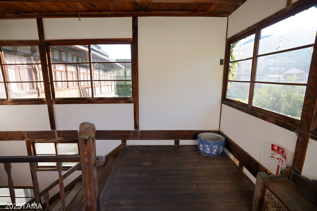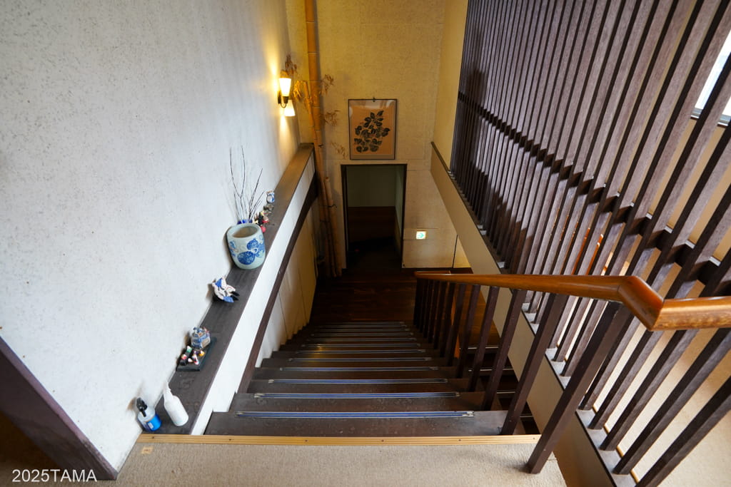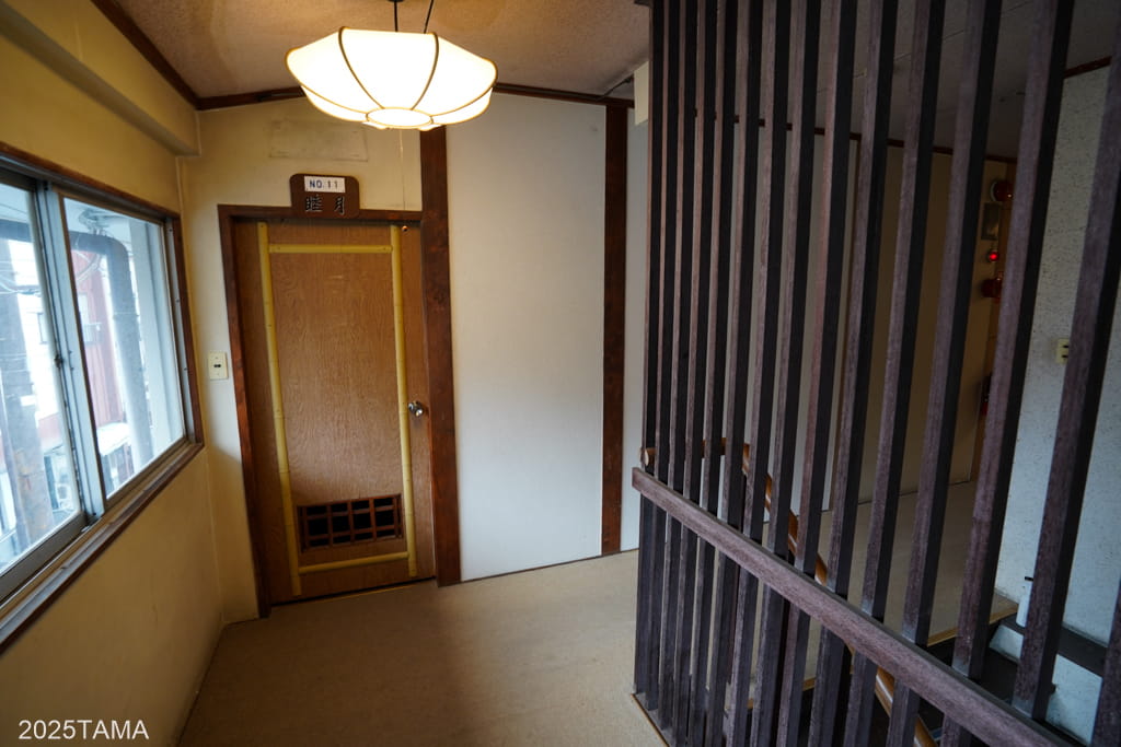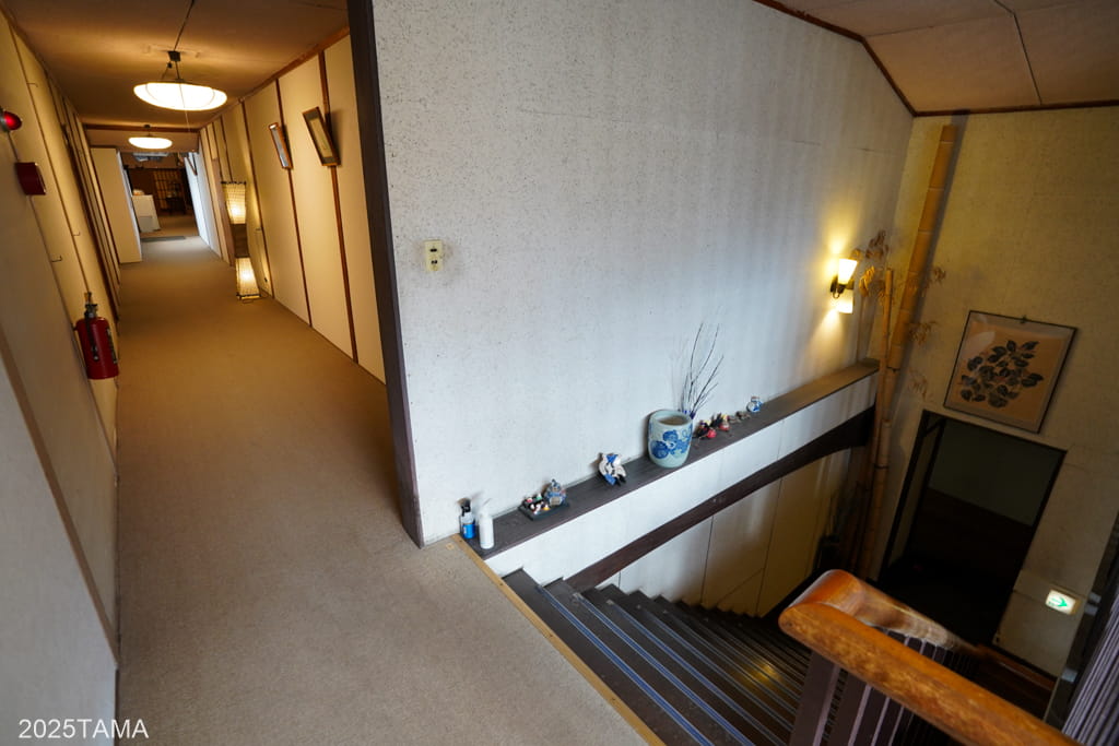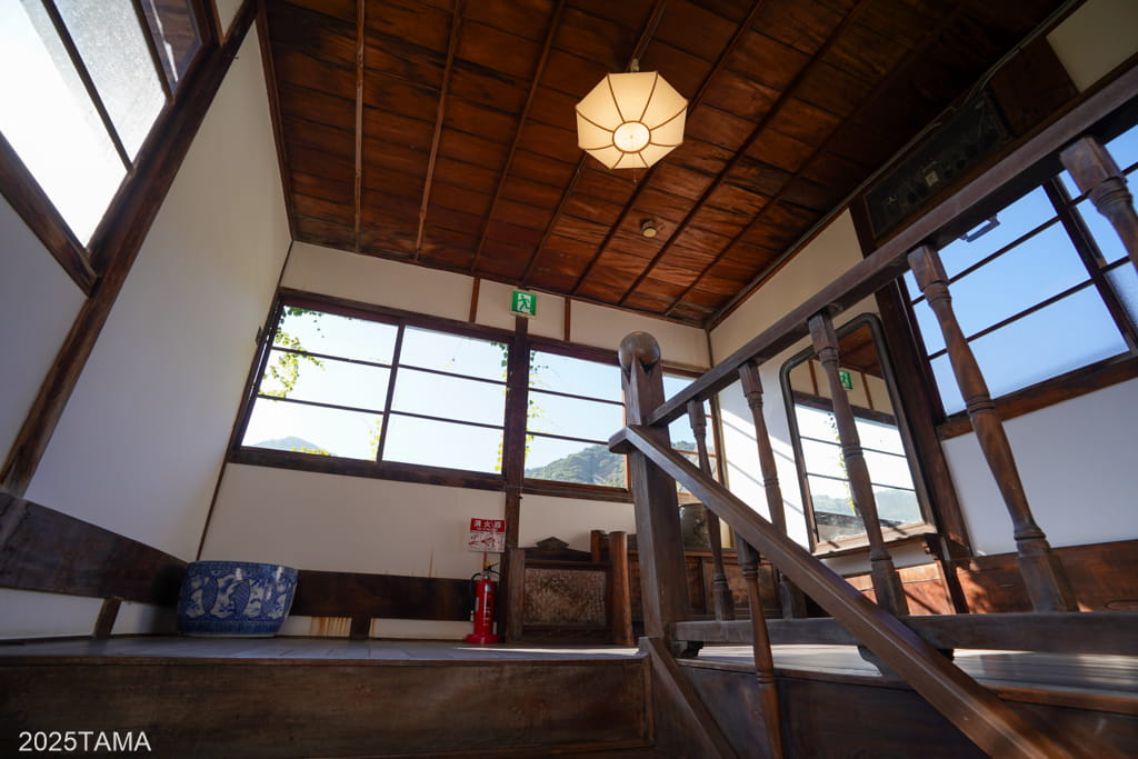 で、個人的にもっとも好きになったのがこの中央階段周辺の造りと景観です。「木造建築」らしさが全面に押し出された一角であり、柳屋旅館を唯一無二たらしめているのはここだと言っても過言ではないだろう。