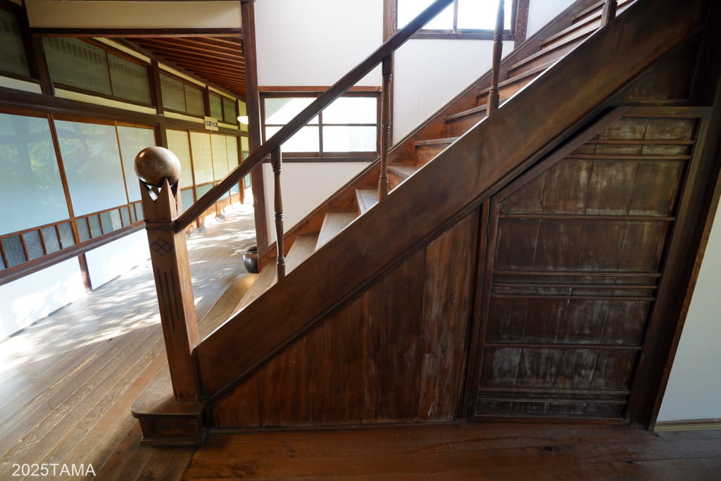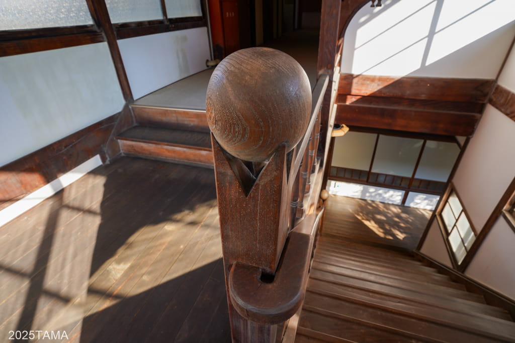 踊り場に足を踏み入れると、それまでずっとカーペット敷きだった床がここにきて急に床板のみになります。従って年季の入った濃い色の板の上を直接歩くことができると同時に、足の裏に伝わってくる感触も如実に変化する。わずかに軋むような床板独特の感触がまさに木造建築って感じでとても心地良いです。