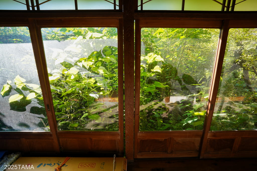 正面の窓からは、これから向かうことになる温泉の建物とそれに続く通路が見えます。ちなみに踊り場周辺の窓はいずれもガラス一枚のみで構成され、開閉ができないくらいに建付けが悪くなっていました。