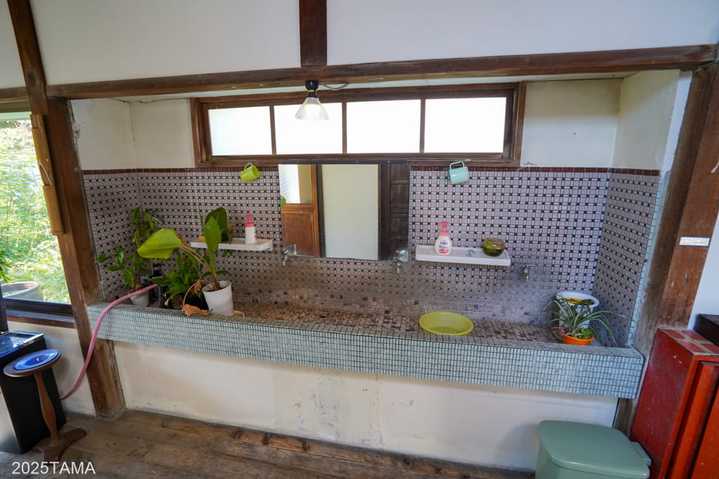 温泉までの道中にある、この洗面所の雰囲気もかなり好き。全体を構成する「木」の要素と洗面所のレトロな「石」の要素が融合しているのが良いです。