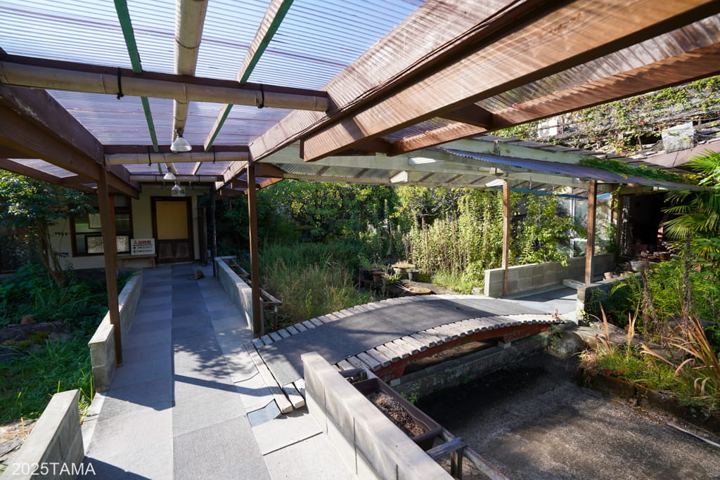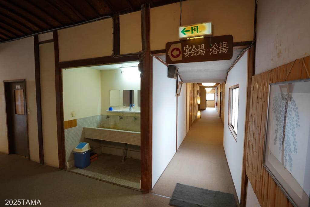 通路の右横には池の跡がありました。なお本館からの通路とは別に別館からも通路が伸びて途中で合流しているため、別館に宿泊していた場合でも本館へ迂回する必要はありません。