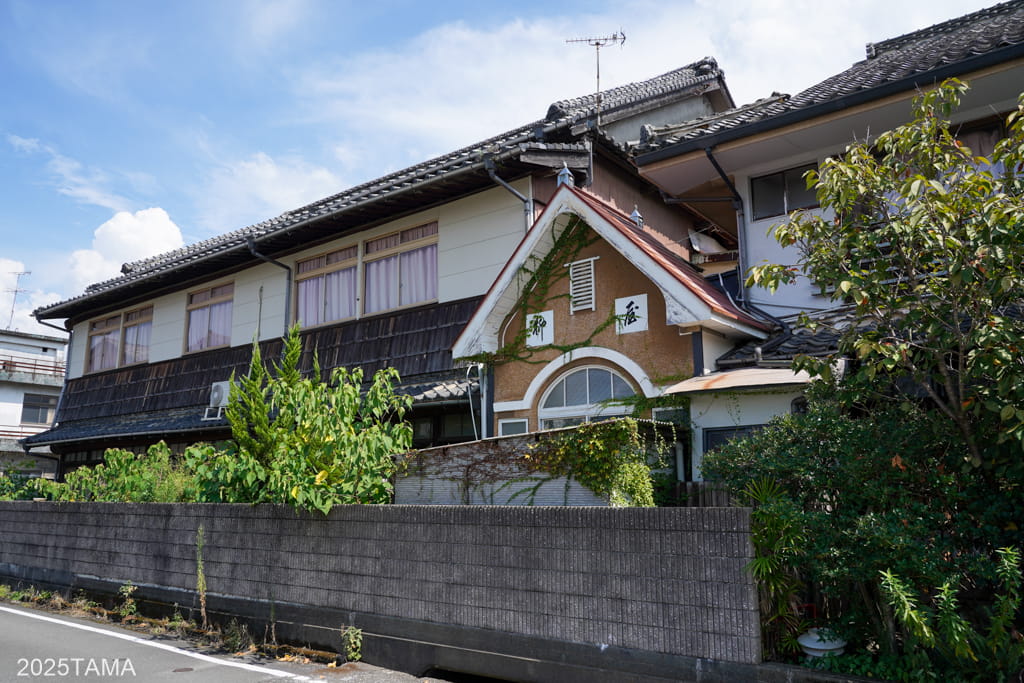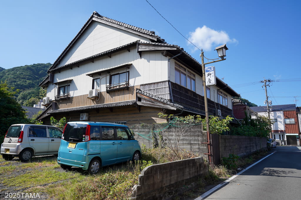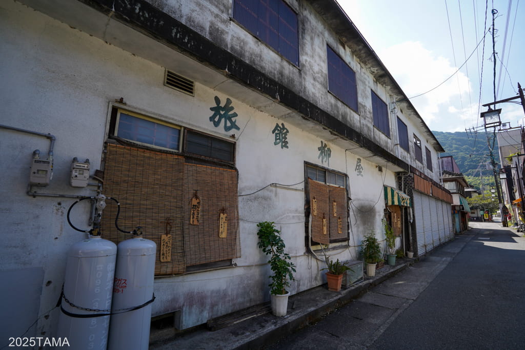 本館右側を通りに沿って歩いていくと途切れることなく建物が続き、中間地点の窓付きの部分の壁には「旅館柳屋」の文字。