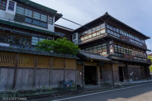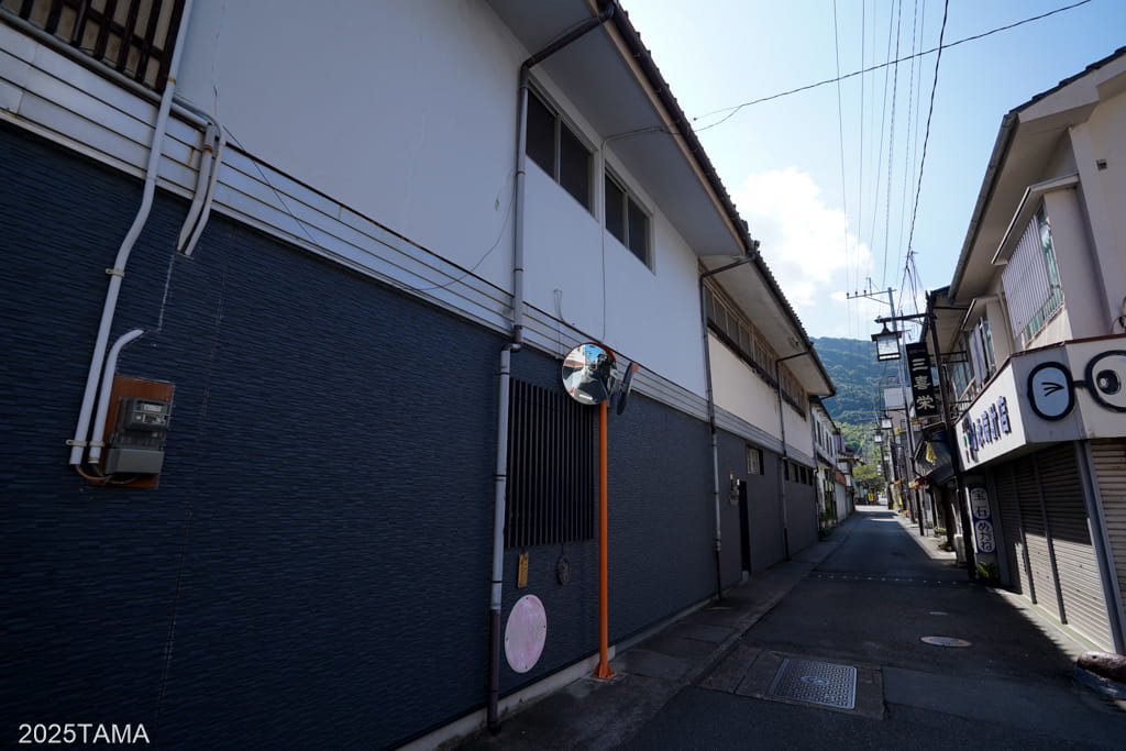 そのまま表通りとは反対側に歩いていき、あたらし屋旅館前から見た本館裏側のアングル。手前側の広場にも昔は何らかの建物があったみたいですが、更地になっていて見通しがいいです。
