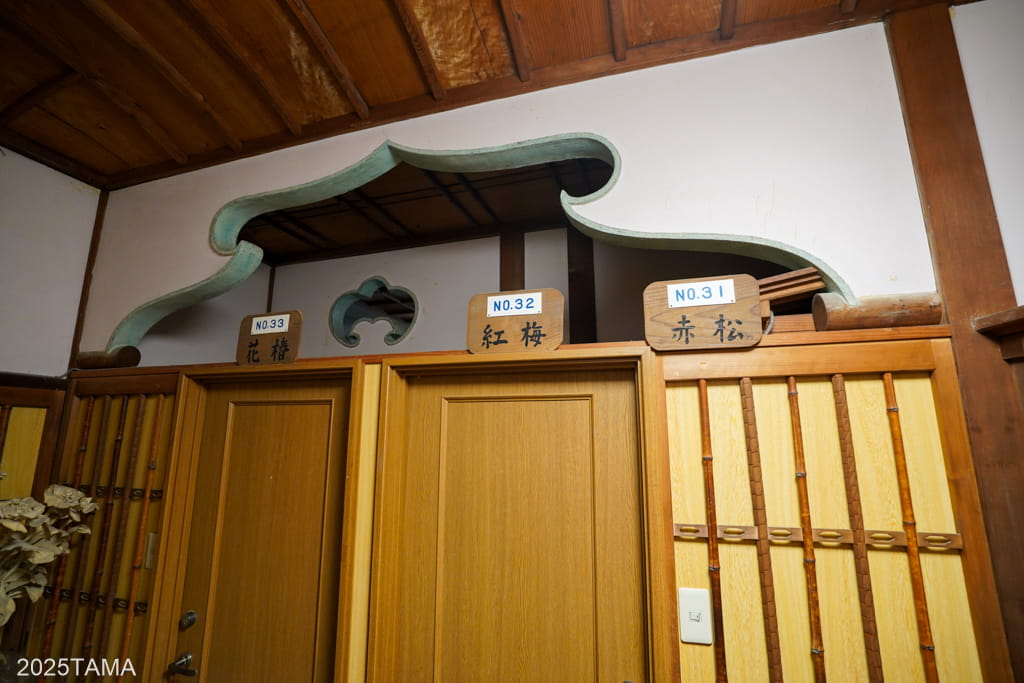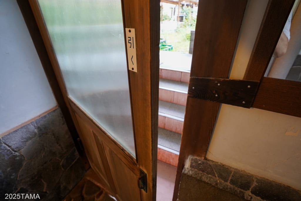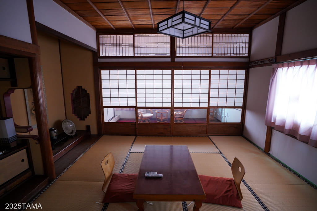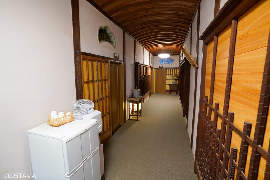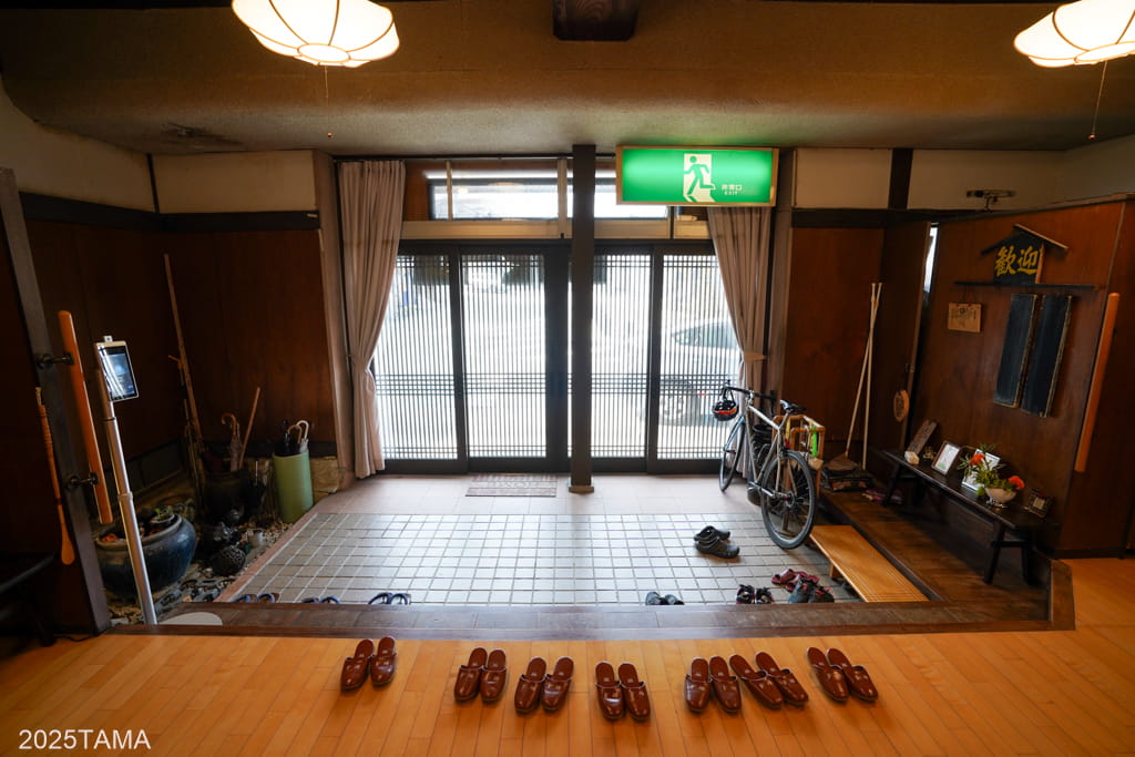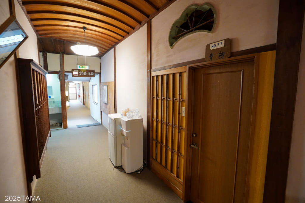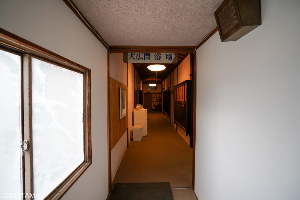 ここが外観確認時に見えた三角屋根の箇所にあたり、ここから手前の玄関側が新しめ(ビジネス用)のエリア、奥が古めのエリアとなります。想像するにビジネス用は設備が多少新しかったり、広さ自体も控えめで料金を抑えているっぽいです。