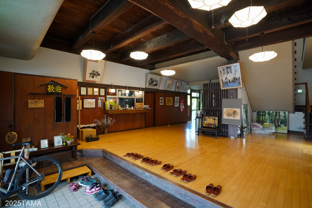 館内の造りを簡単に説明すると本館1階には玄関、帳場、居間、朝食会場の大広間、洗面所、トイレなどがあり、客室はすべて2階となります。また本館中央付近にある階段を下ればすぐに温泉へと向かうことができ、夕食が必ず提供されるわけではないという点も含めて1階の滞在時間は少なめ。