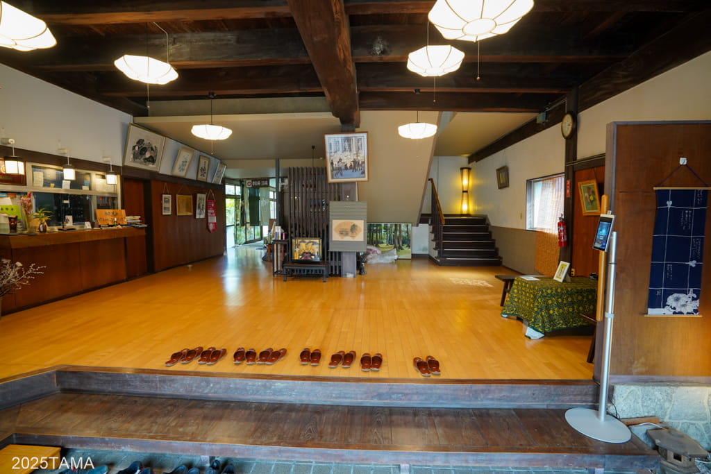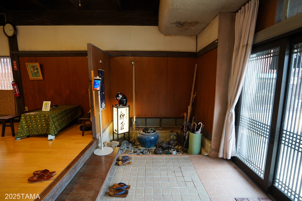 古い建物では廊下が狭かったり階段が急だったりと、大人数で使用する前提ではない箇所も見られますが、柳屋旅館では基本的にどこをみても広々としています。その最たる例がこの玄関周辺で、玄関土間も広ければ上がってからの空間も広い。横幅も高さも十二分にあって窮屈感がまるでありません。