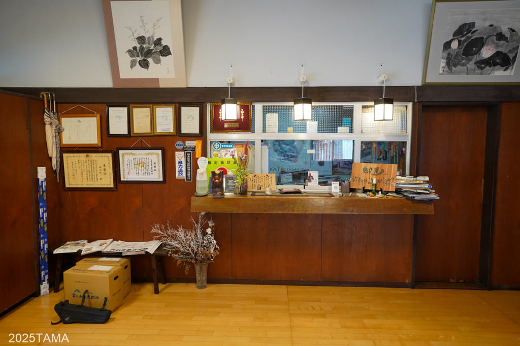 玄関を上がって右奥に2階への階段、左側に帳場、左奥へ進めば温泉への通路や大広間があります。