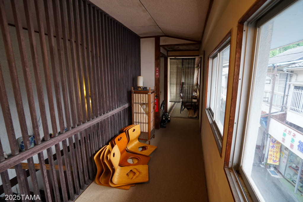 廊下を歩いて古びた中央階段を下って1階へ向かい、階段を折り返して通路を歩いていくとヒナちゃんのスリスリタイムがあって、温泉から上がって客室へ帰るまでの区間もまた同じ。要は自然と中庭方面へ行きたくなる要素が多くて客室内にいる時間は短かったです。