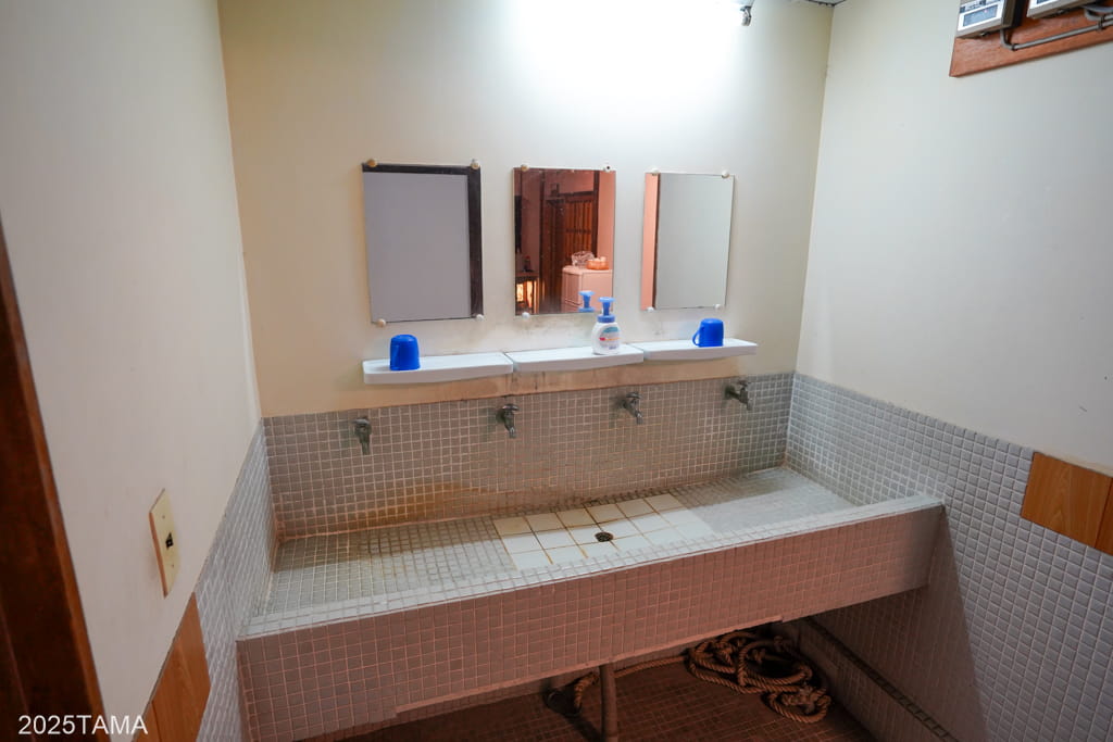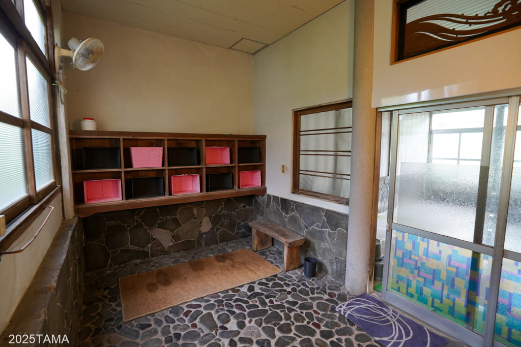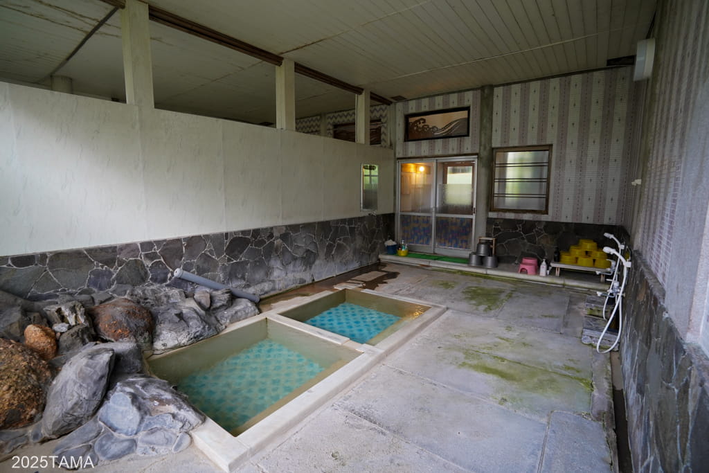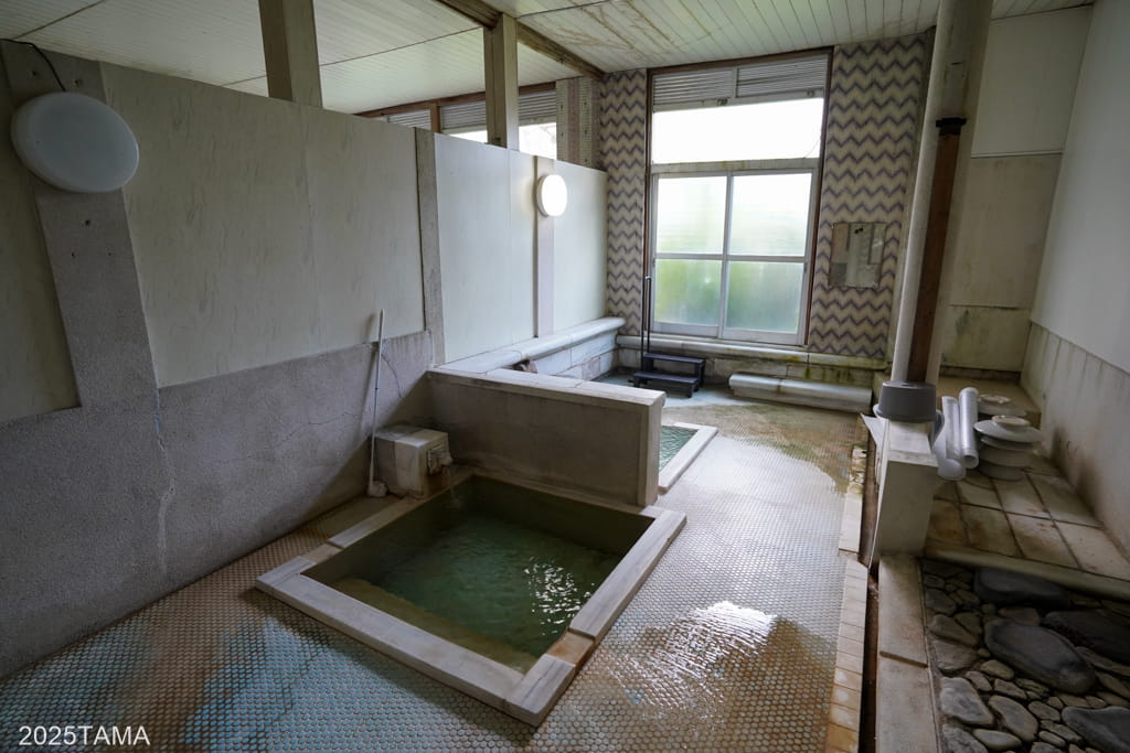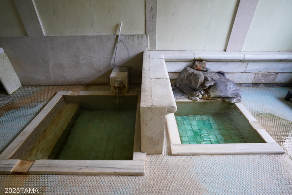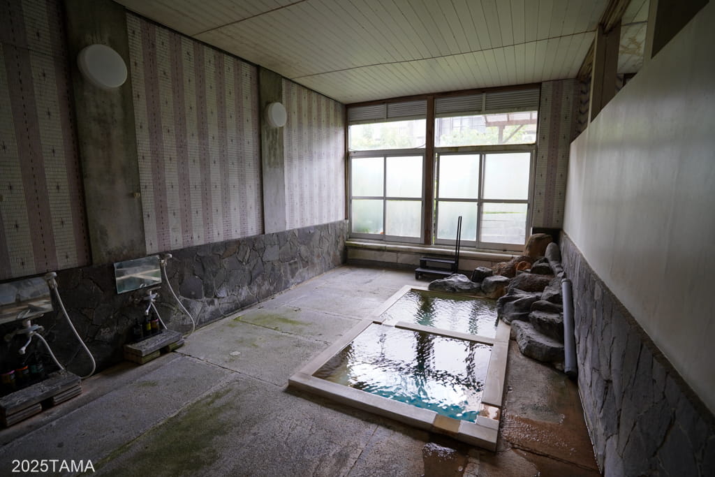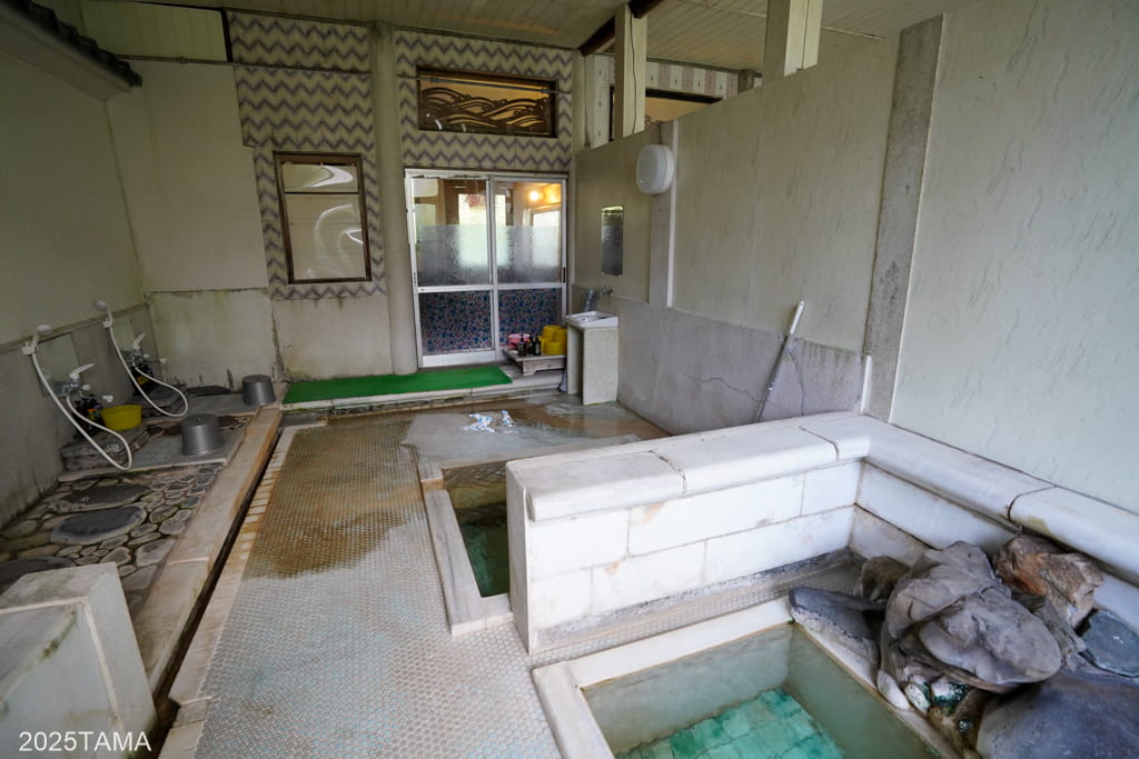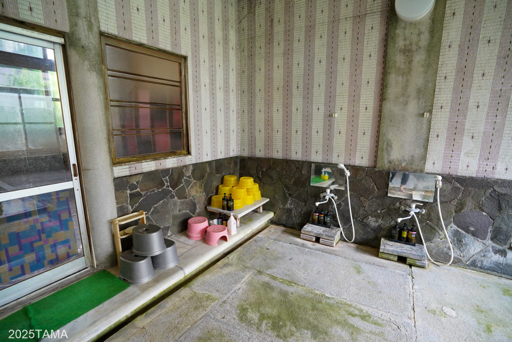 今日の宿泊者が自分一人だったため女湯にも入ることができました。女湯の浴室の方はこんな感じで、それぞれの浴槽が完全に独立しています。男湯と女湯が左右対称ではなく異なる造りというのも珍しい。