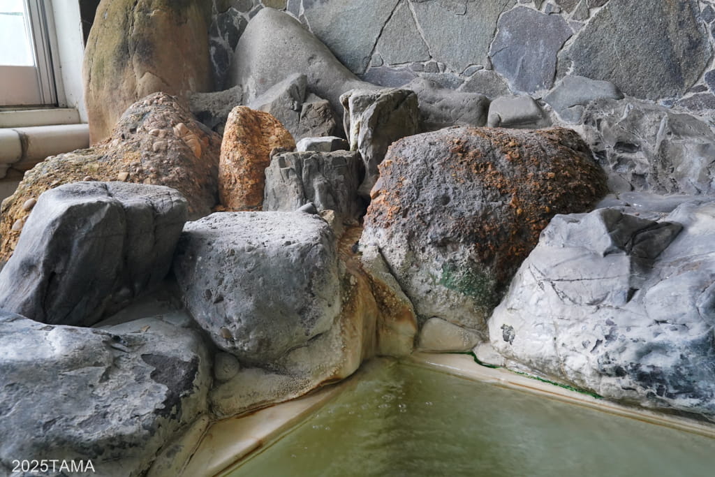 温度については源泉が直接注がれる上流側の浴槽の方がやや熱め、下流側が少しぬるめで夏場でも長く入れるくらいのちょうどいい温度。湯は癖がなく味も特にありませんが、肌についた塩分が放熱を防ぐため保温効果が高いです。浴槽を構成している石の硬さが適度に気持ちよく、安心して身体を預けて浸かっていました。