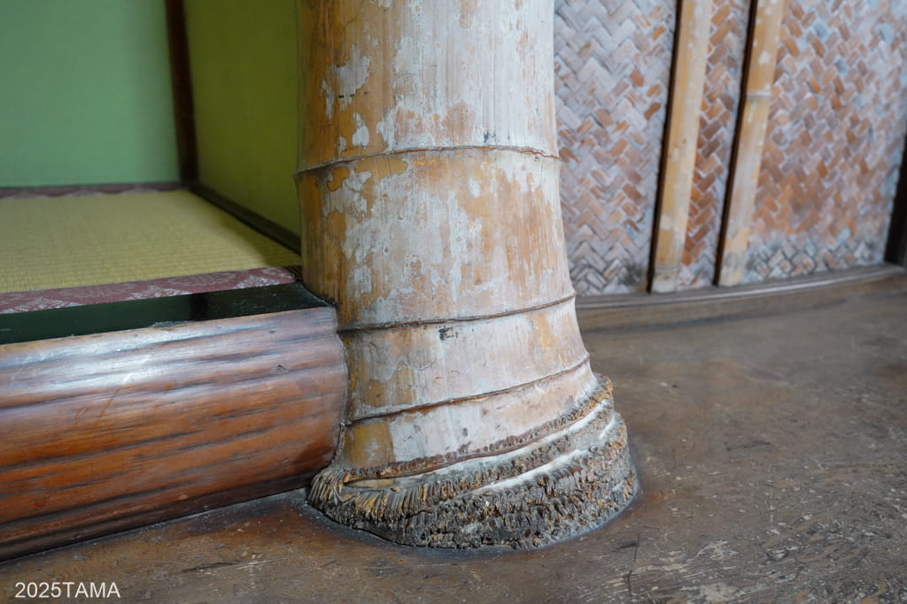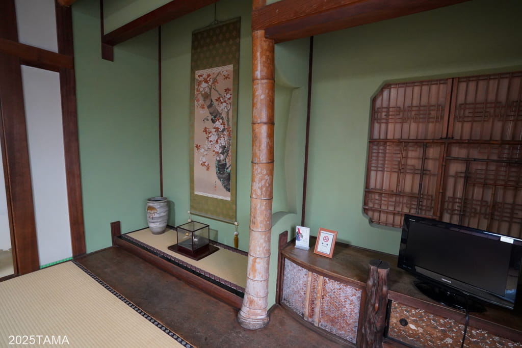 太い竹で作られた床柱に加えて網代編み且つ微妙に円弧を描いている形状の戸袋、また床の間奥の飾り窓など、どこを見ても凝りに凝られていました。建築当時は職人さん楽しかっただろうな。こだわり抜いた木をつかって、職人が持つ技術を注ぎ込んだ感があります。