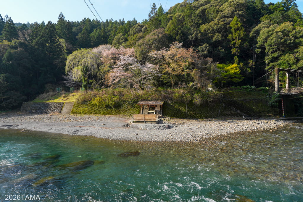 橋を上からは上流側と下流側の様子が確認でき、下流側の河原には昔の橋桁や橋脚と思われる木材が積み重なっていました。その木材の上からは別の木が生えており、現在架かっている橋も年代が古いものですがそれよりも前の姿があったようです。