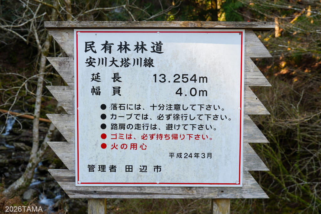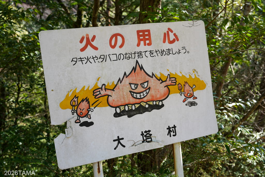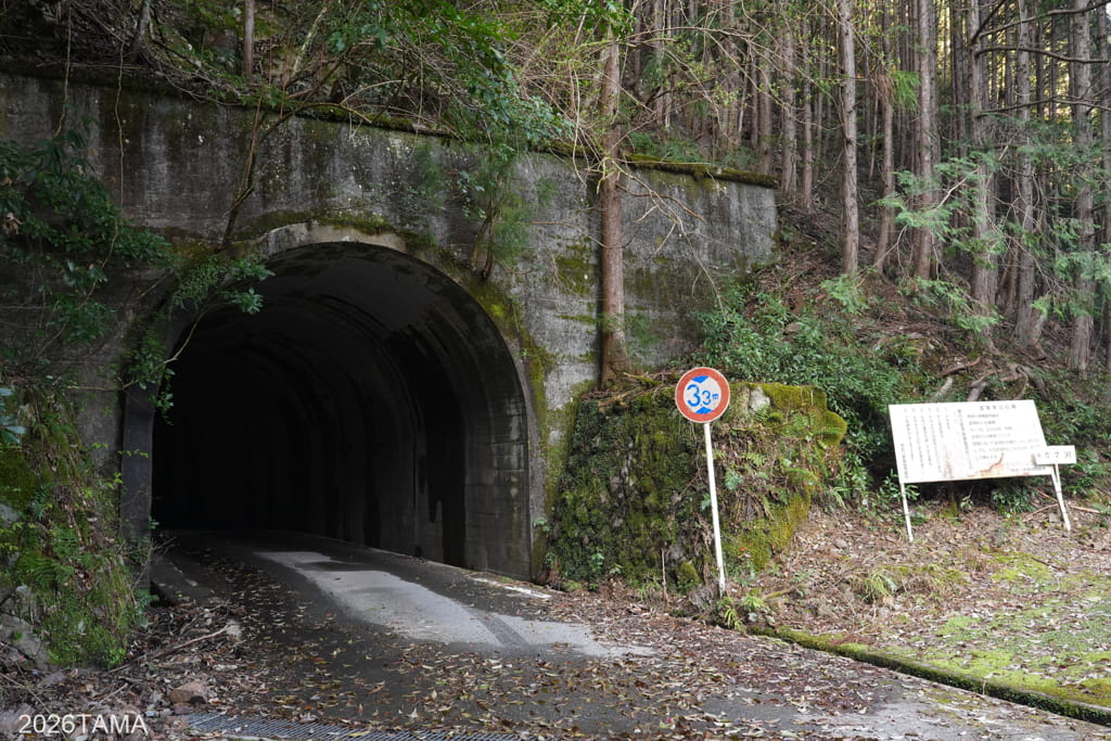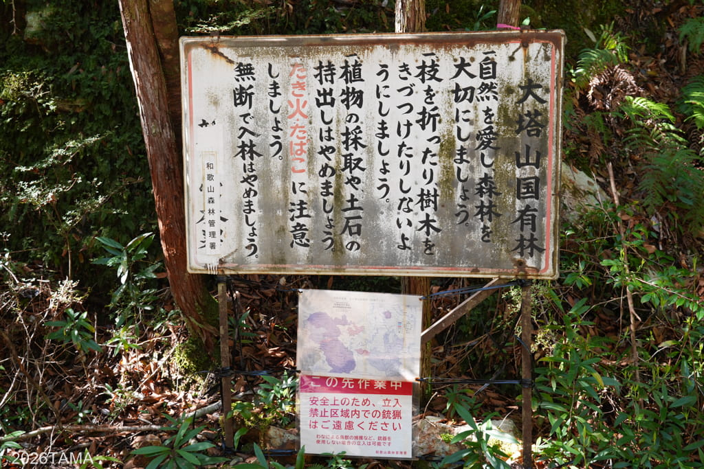 トンネルの左側には、ここが大塔川国有林であることを示す看板が。この経年劣化感がよい。