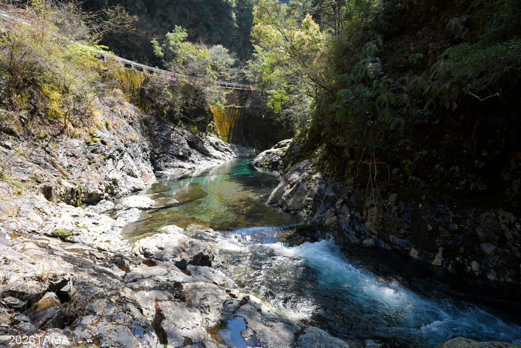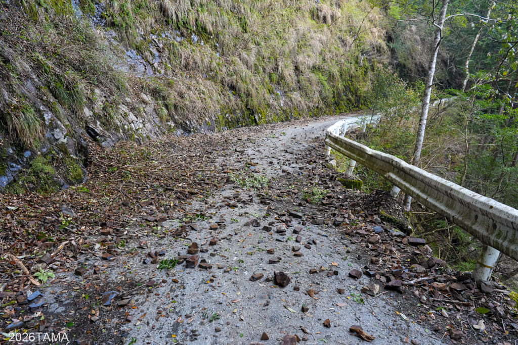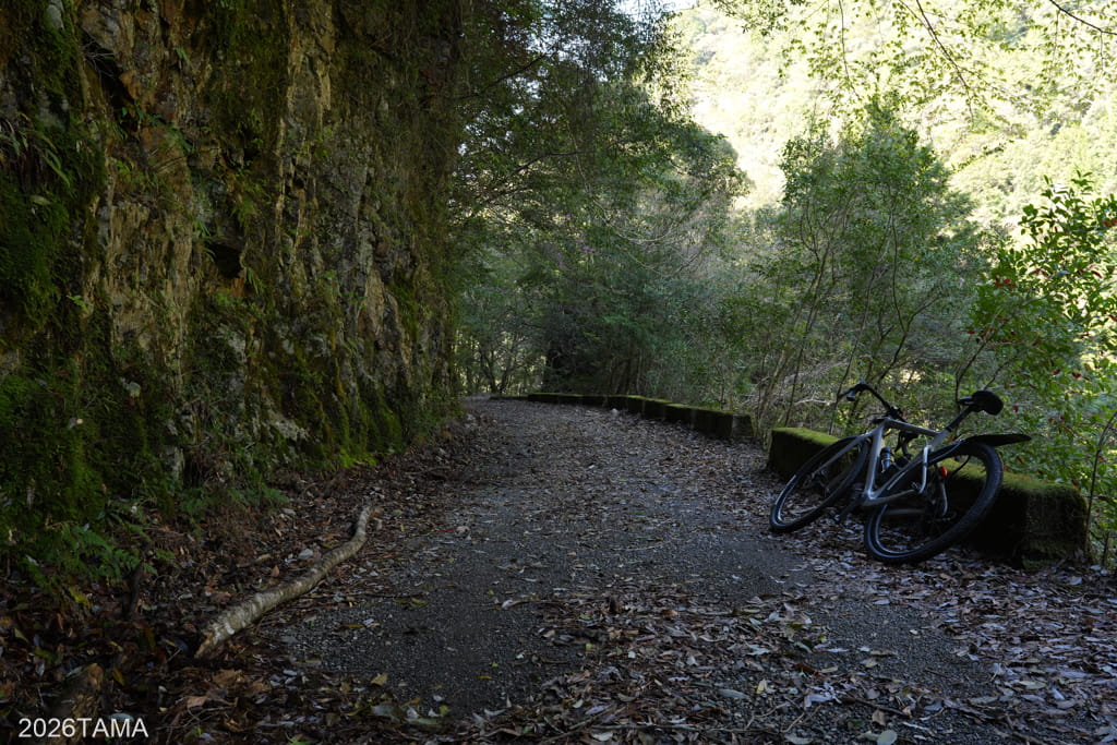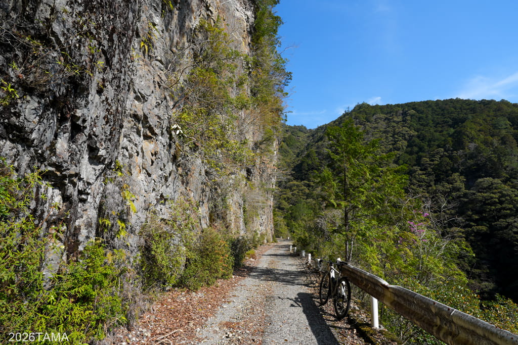 崖沿いから古びた橋の上、はたまた切通しに中を抜けて川の上流方面へ。崖沿いにはガードレールではなく背の低いコンクリートを擁壁や縁石として用いている点が新鮮でした。
