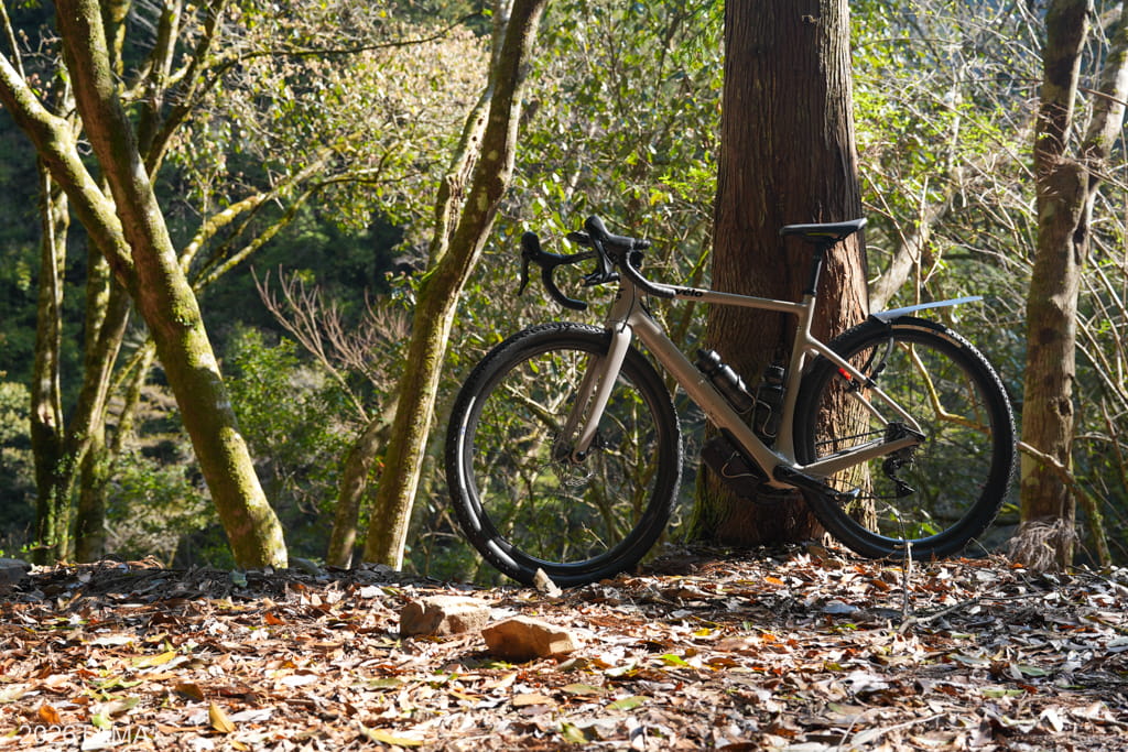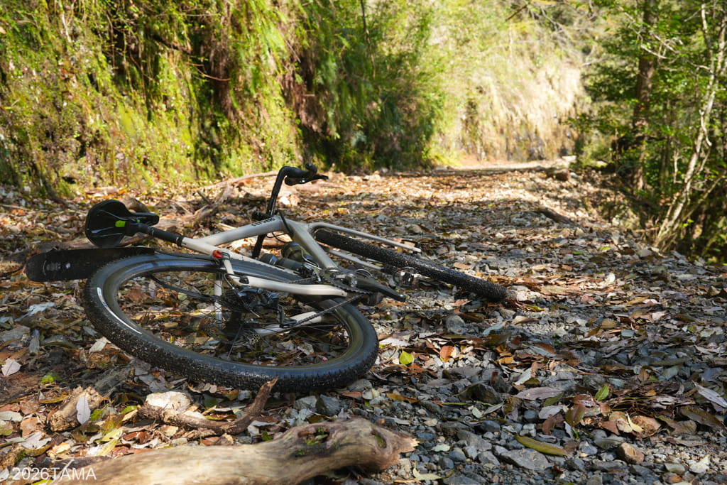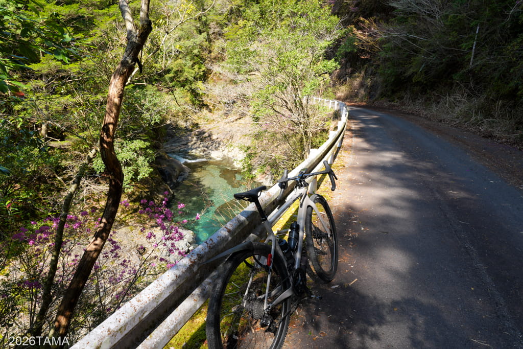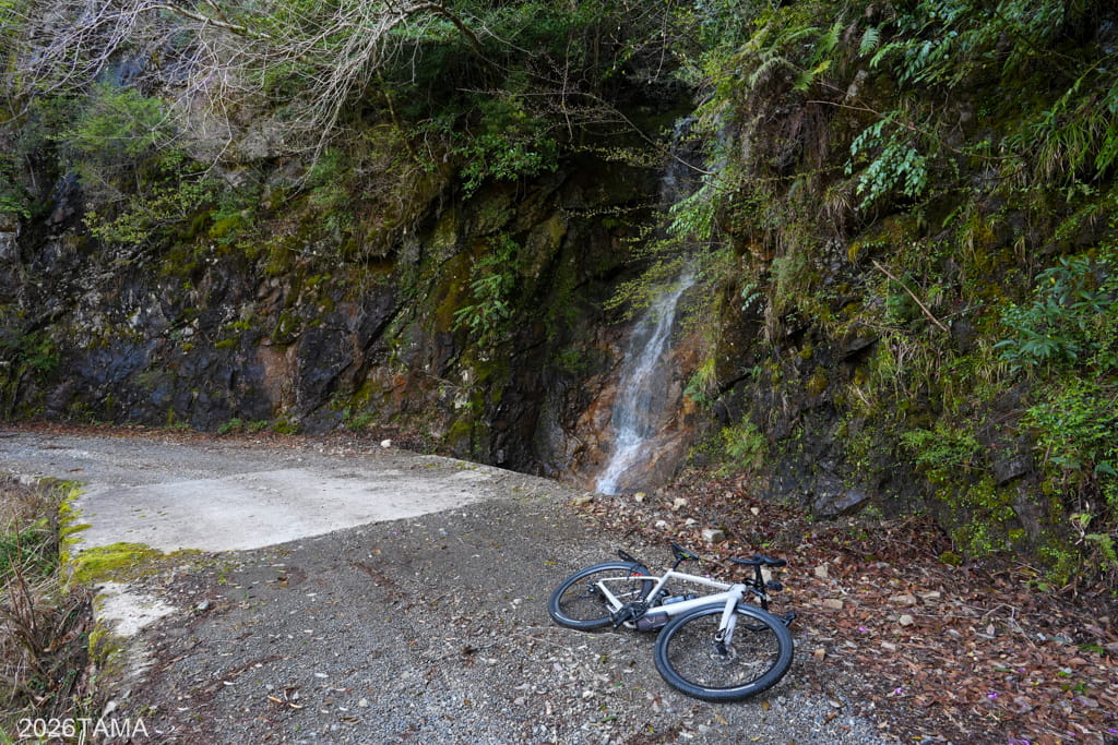 自動車どころか人間すら遭遇しない場所であり、川や滝の音、鳥の鳴き声といった音に対して自動的に意識が向くようになります。林道と川面との距離も場所によって様々に変化し、景色だけでなく聞こえてくる音も一定ではない。虫の存在がまだ大きくない春の時期のなか、陽の光を浴びながら走ることが精神的なリラックスに繋がっている。グラベルライドのメリットはこういうところにあるだろう。