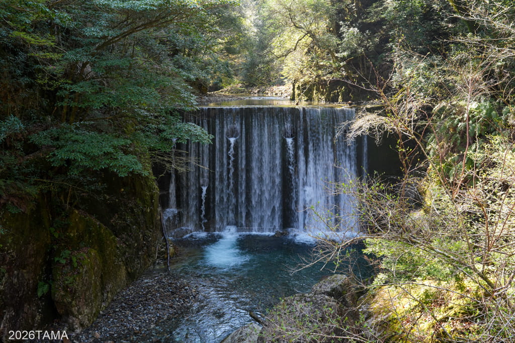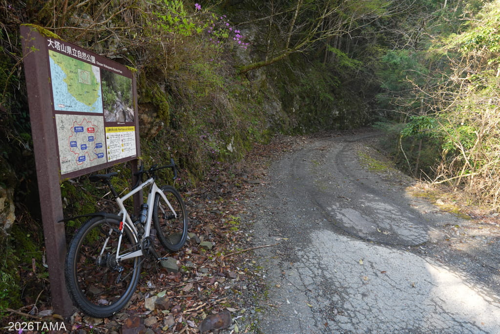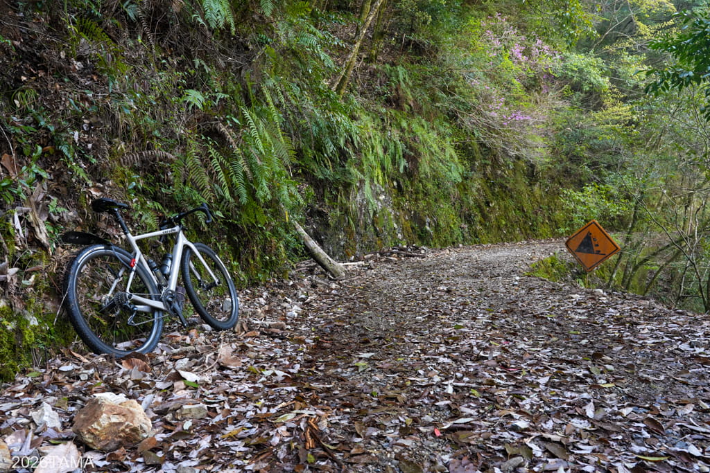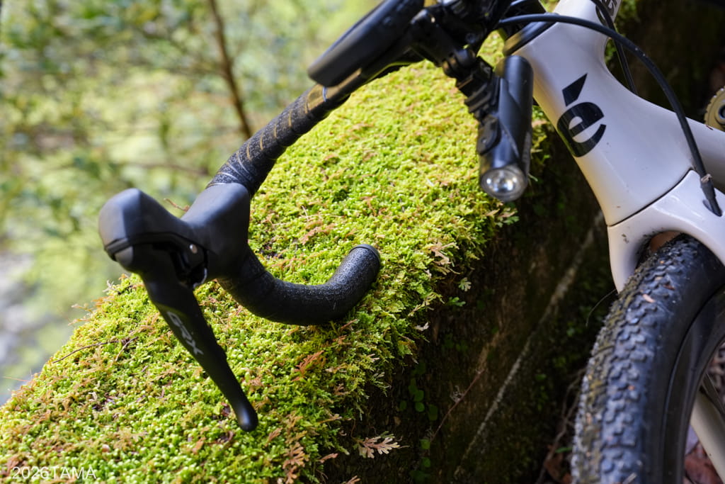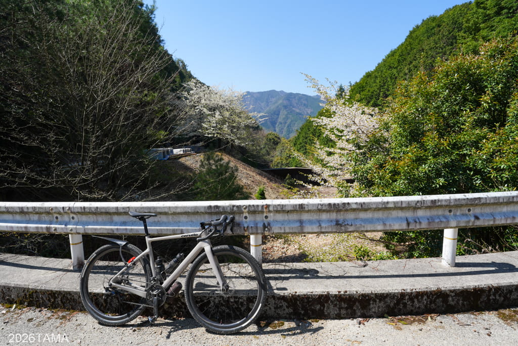 自動車どころか人間すら遭遇しない場所であり、川や滝の音、鳥の鳴き声といった音に対して自動的に意識が向くようになります。林道と川面との距離も場所によって様々に変化し、景色だけでなく聞こえてくる音も一定ではない。虫の存在がまだ大きくない春の時期のなか、陽の光を浴びながら走ることが精神的なリラックスに繋がっている。グラベルライドのメリットはこういうところにあるだろう。