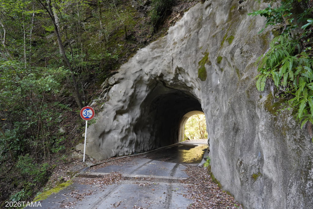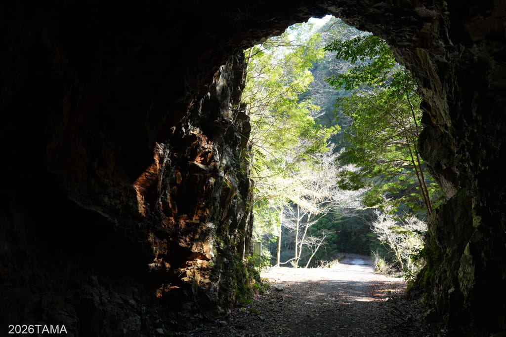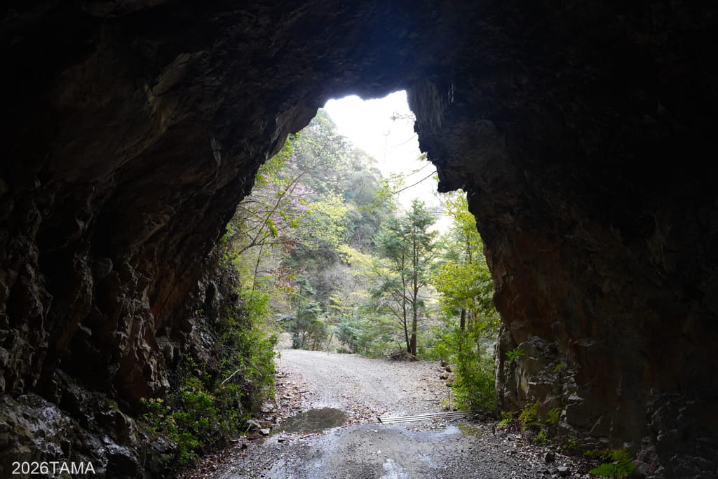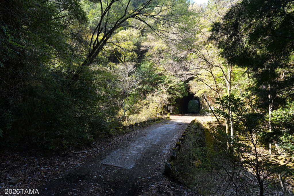 素掘りトンネルを通過した先で大塔川は二股に分かれていて(下流から上流へ向かっているためここで川が合流する形)、道はそのうちの東側の川沿いに続いています。道の向こう側には古びた橋が見え、橋をわたった先に登場してきたのはまたしても素掘りトンネル。