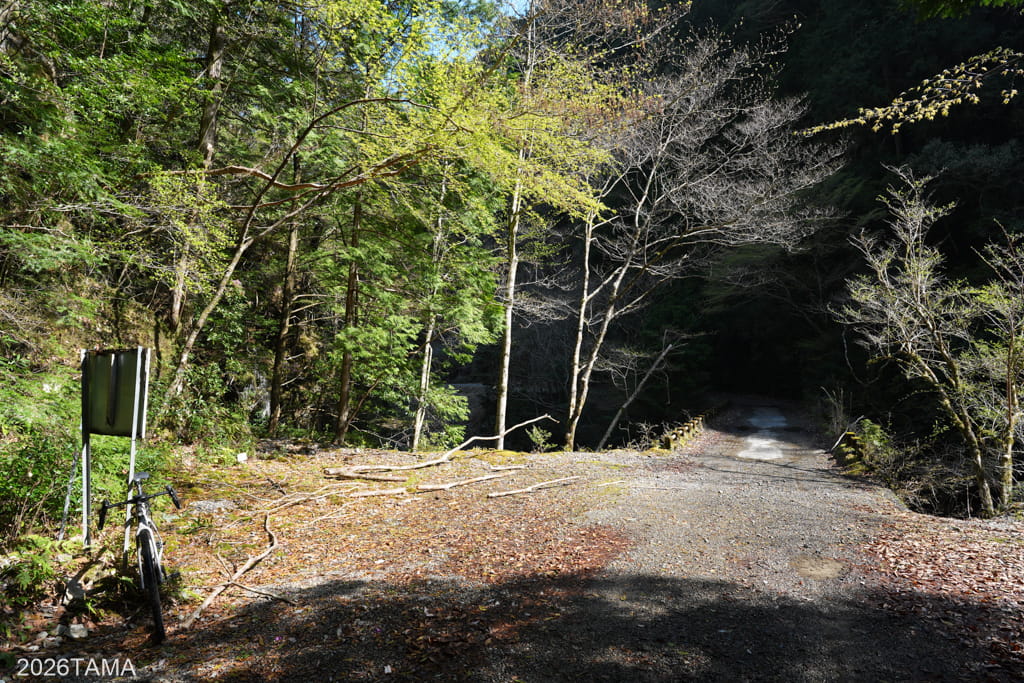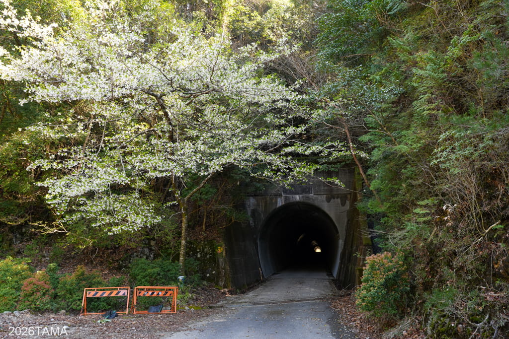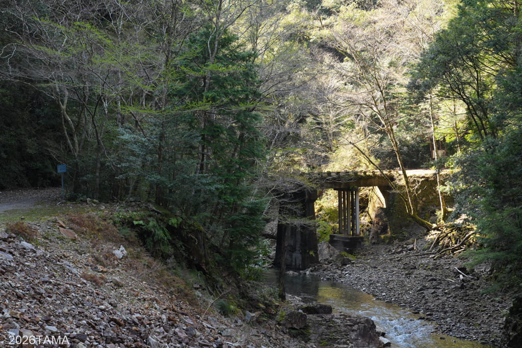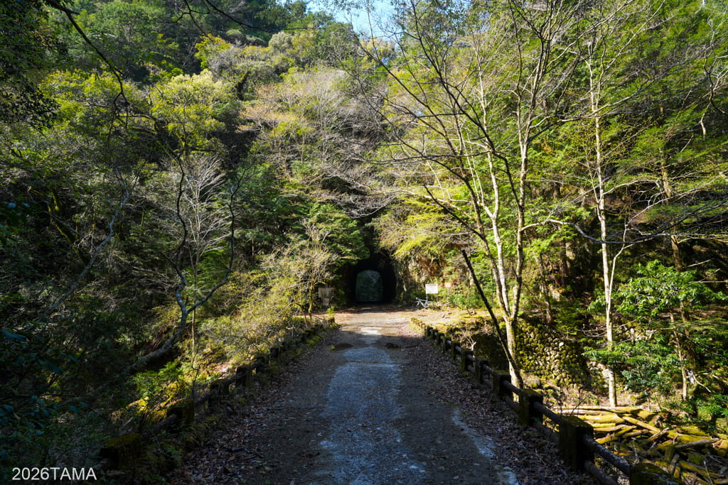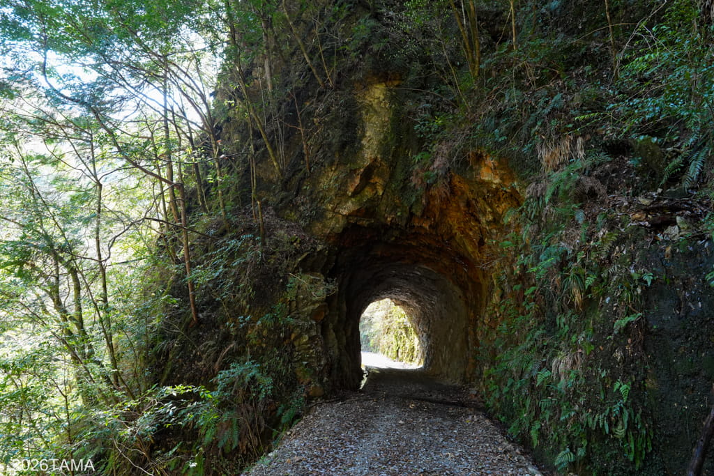 素掘りトンネルを通過した先で大塔川は二股に分かれていて(下流から上流へ向かっているためここで川が合流する形)、道はそのうちの東側の川沿いに続いています。道の向こう側には古びた橋が見え、橋をわたった先に登場してきたのはまたしても素掘りトンネル。