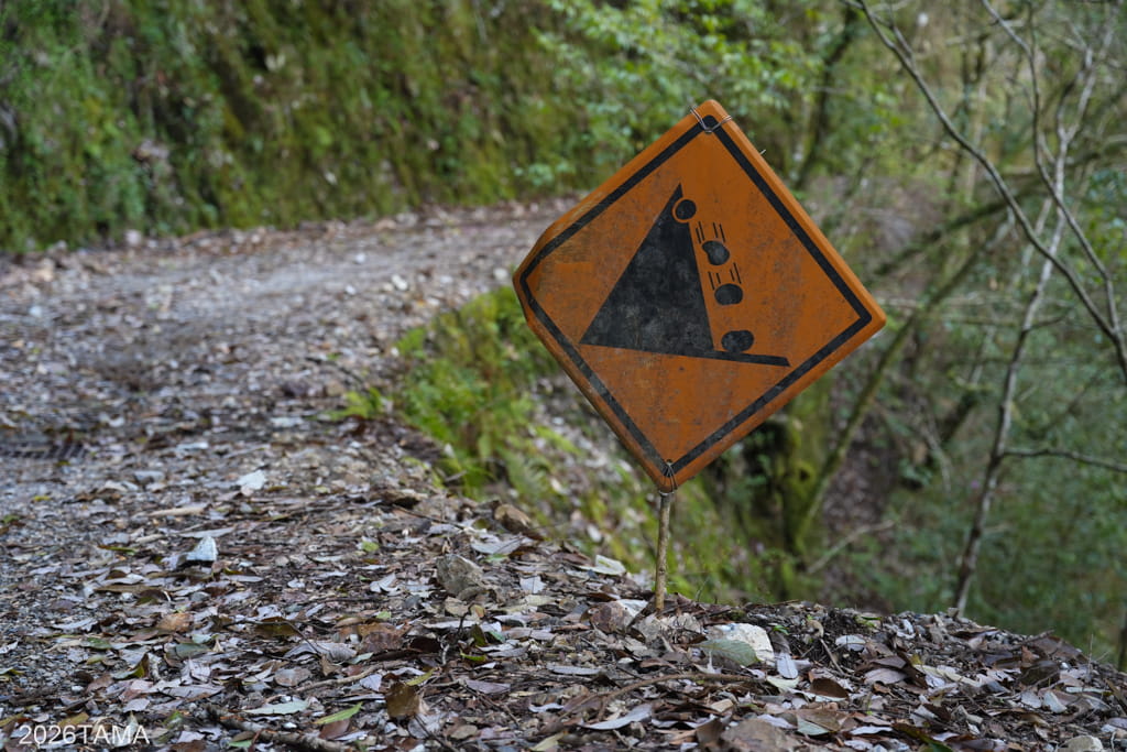 えらく低いところにある落石注意の看板。林道上にガードレールが設けられているのはほんの一部の区間だけで、残りは道路の脇がすぐ崖になっています。
