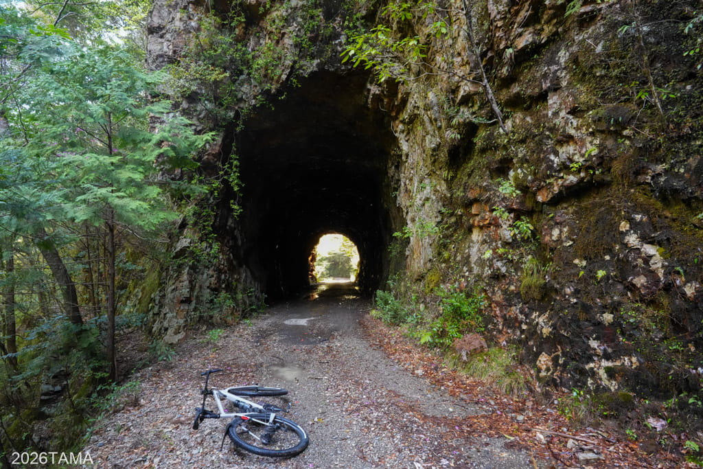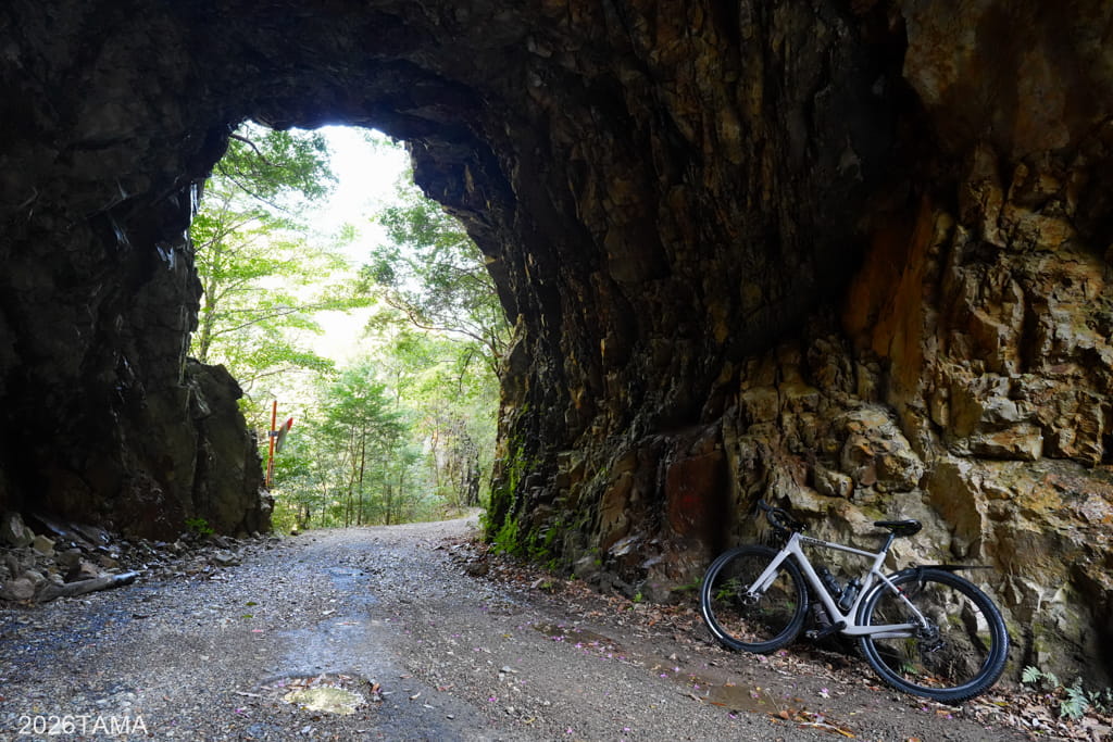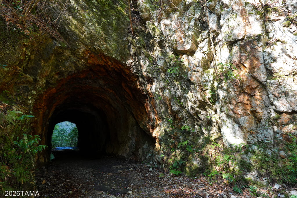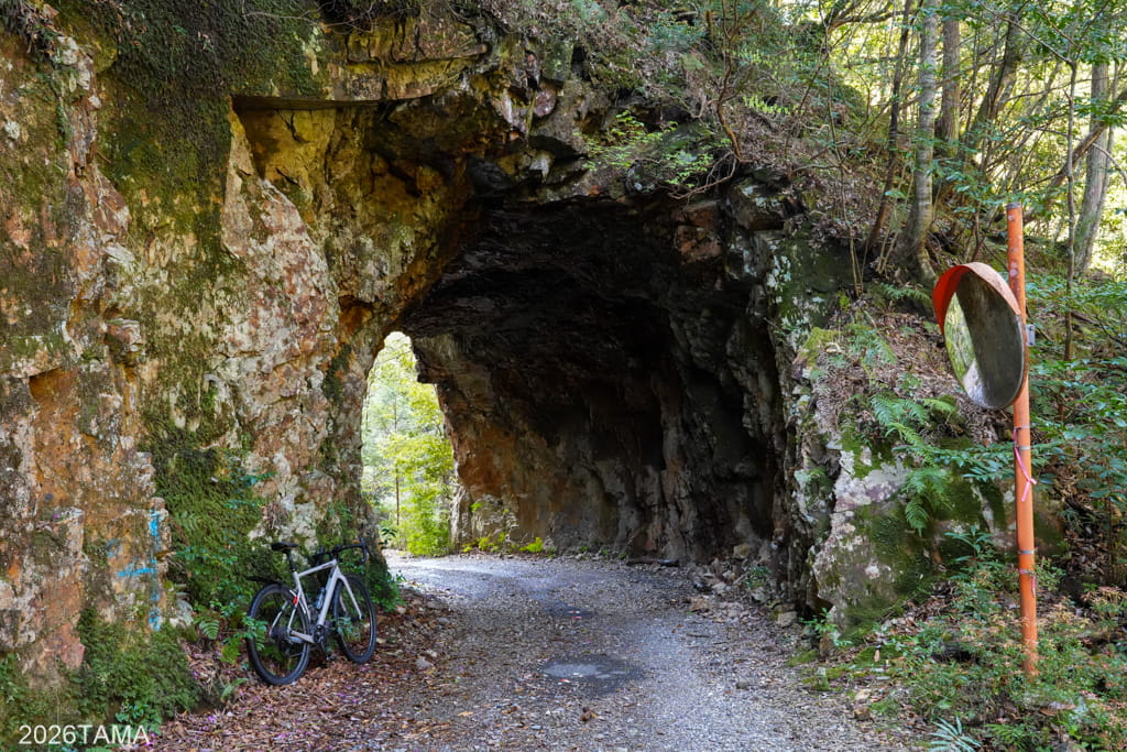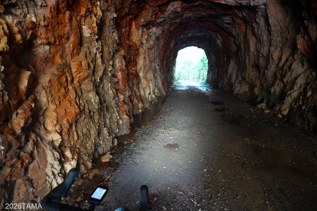 それがこの素掘りトンネル(隧道)で、その名の通り岩肌や地層を人力で採掘したもの。重機をここまで持ってこれないとなるとこうするしかないものの、ここまで大きな穴を崩落させずに貫通させるのは技術力が要るはず。実際に林道を走るまでは一般的な林道だと思っていたところが、思いがけない遺構が現れて嬉しい。