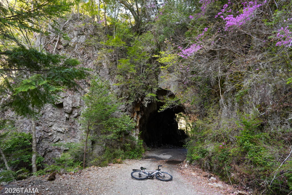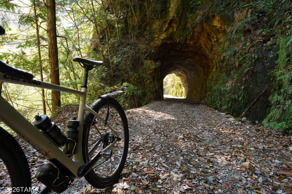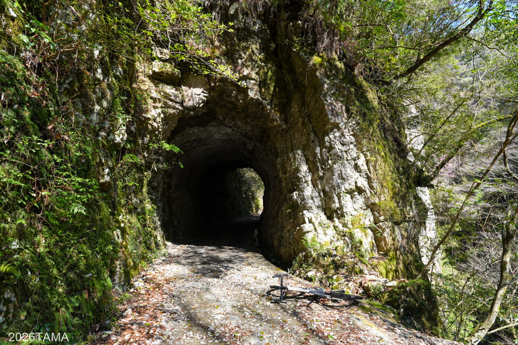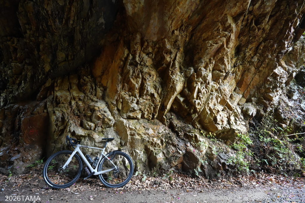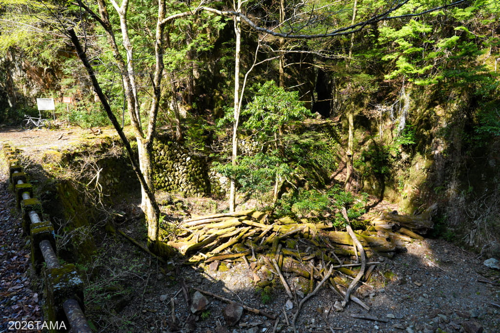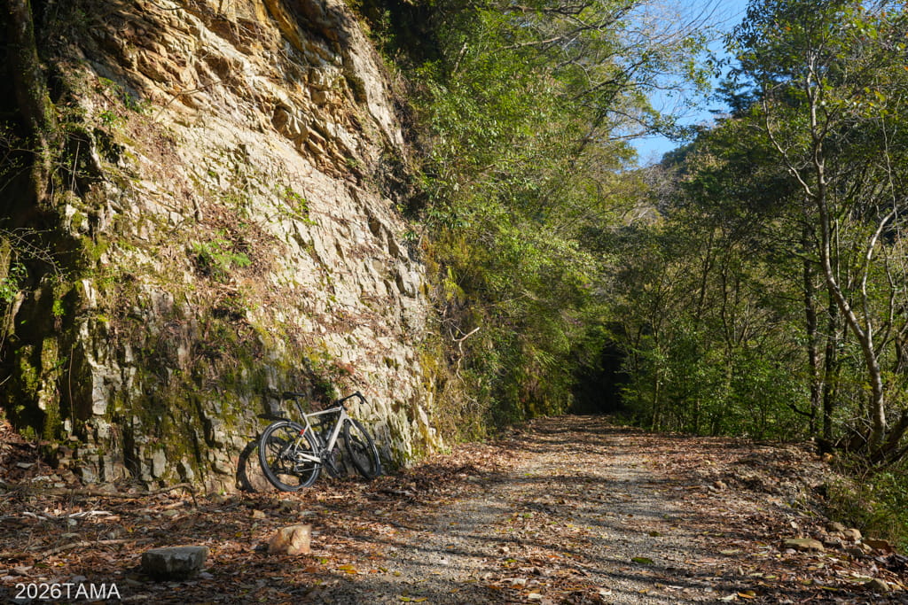 それがこの素掘りトンネル(隧道)で、その名の通り岩肌や地層を人力で採掘したもの。重機をここまで持ってこれないとなるとこうするしかないものの、ここまで大きな穴を崩落させずに貫通させるのは技術力が要るはず。実際に林道を走るまでは一般的な林道だと思っていたところが、思いがけない遺構が現れて嬉しい。