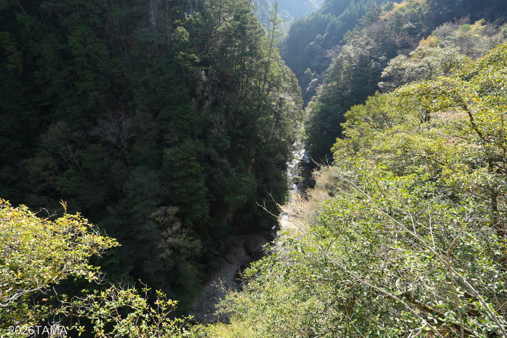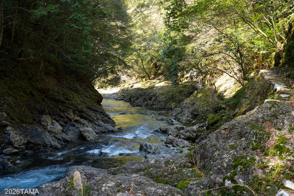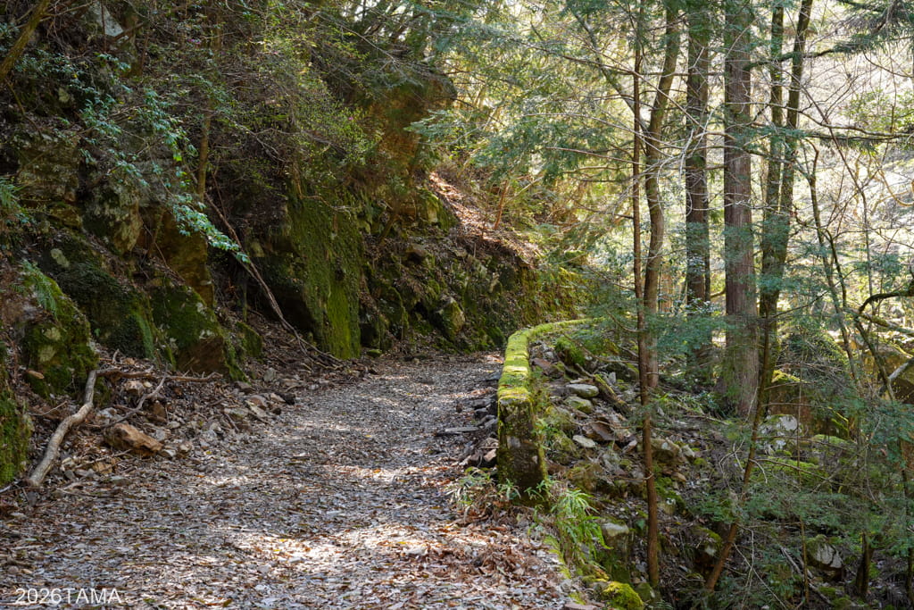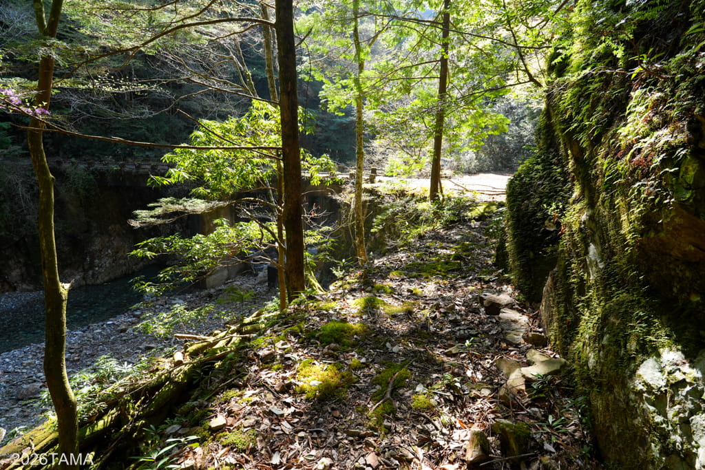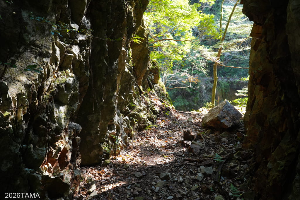 逢合滝を通り過ぎるあたりから谷間に日光が差し込むようになり、体感温度が上がってくる。早朝から朝へと時間が進んでいるのが実感できる。途中には道の左側が頭上のはるか上まで崖になっている箇所があって、その崖に陽の光が当たっている様子が見事でした。木々の緑だけではなく石の要素も感じられて、様相が一様ではないのがいいですね。