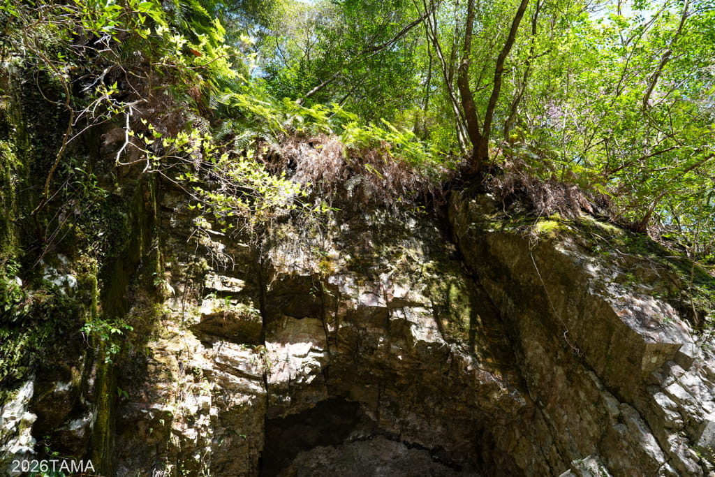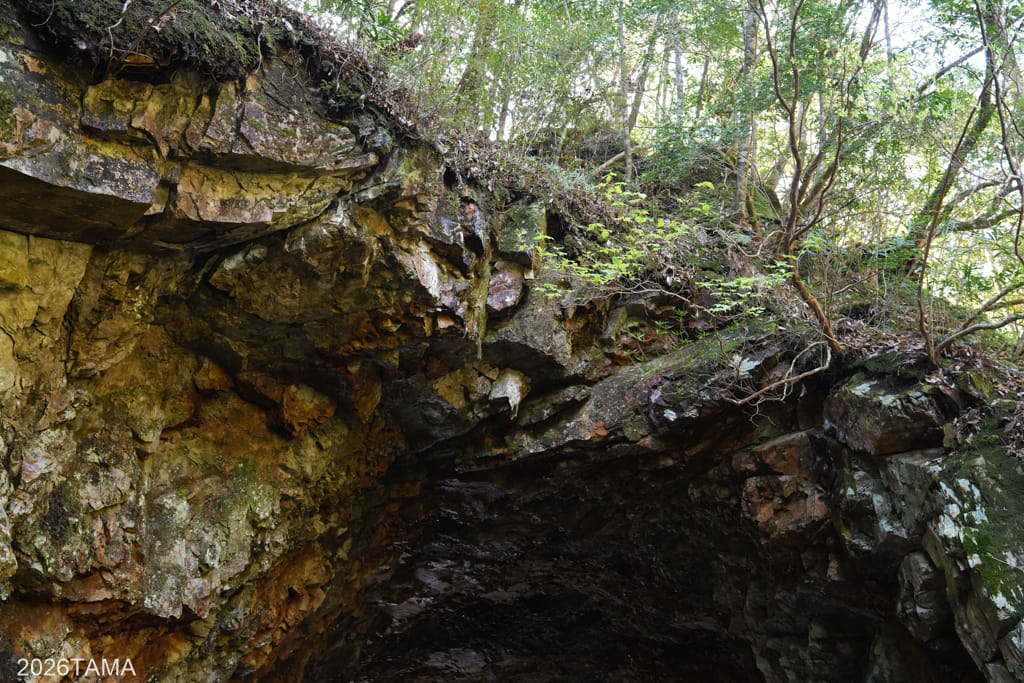 トンネルの入口付近、特に右側や上部の日当たりがよくて周辺の地形がよく視認でき、岩の凹凸や植物と岩が組み合わさった様子が目を引きます。視界の中を構成するものは自然由来のもののみであり、自然界が織りなす色彩のコントラストに感動を覚える。いつ崩れてきてもおかしくない状況がこの場所の良さを増幅させている。