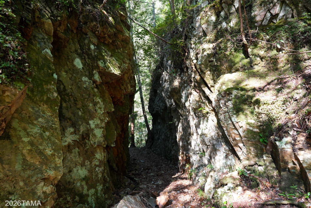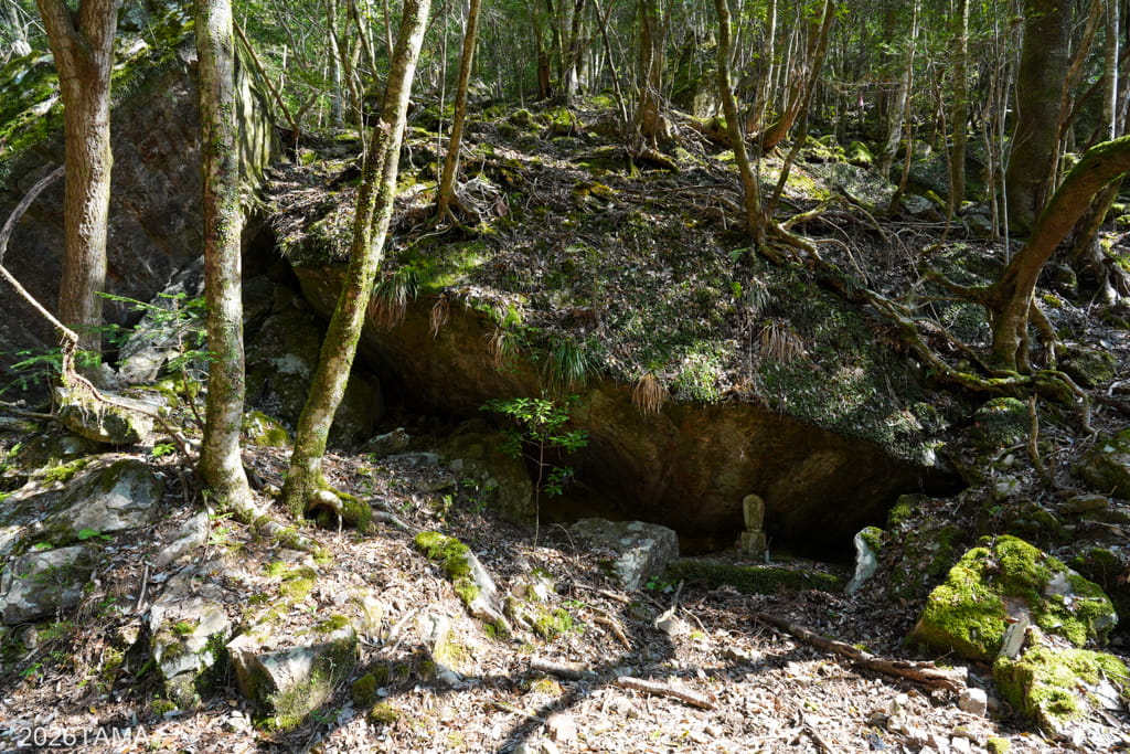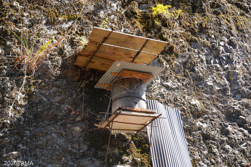 トンネル前の広場から右側へ進むと細い道があり、岩と岩の切れ目の間を縫うように続いていました。明らかに人間が通行するための道ですがトンネルの向こう側に繋がっているわけではなく、伝統的なニホンミツバチの巣箱が設置してありました(後述)。昔は人里からここまでやってきて養蜂を行っていたということだろうか。