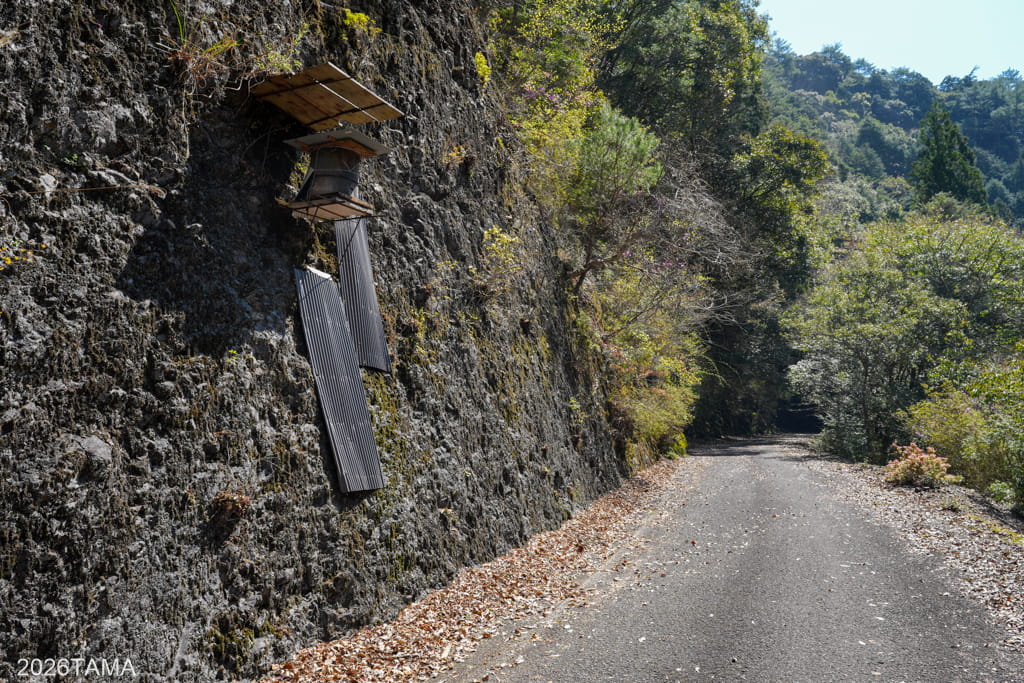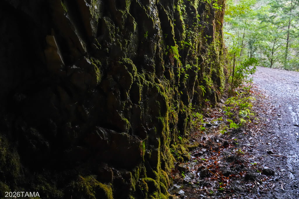 荒々しい壁面の凹凸は場所によって異なり、下に目をやると地面に次回ところには植物や苔が自生しているのが見える。機械化されていない時代の手作業の痕跡が見えるのは趣が深い。またここまで路面のみという平面の要素から、道路開通の痕跡が上下方向に変化しており、山間部の静寂の中に突如として登場してくる様子に惹かれました。