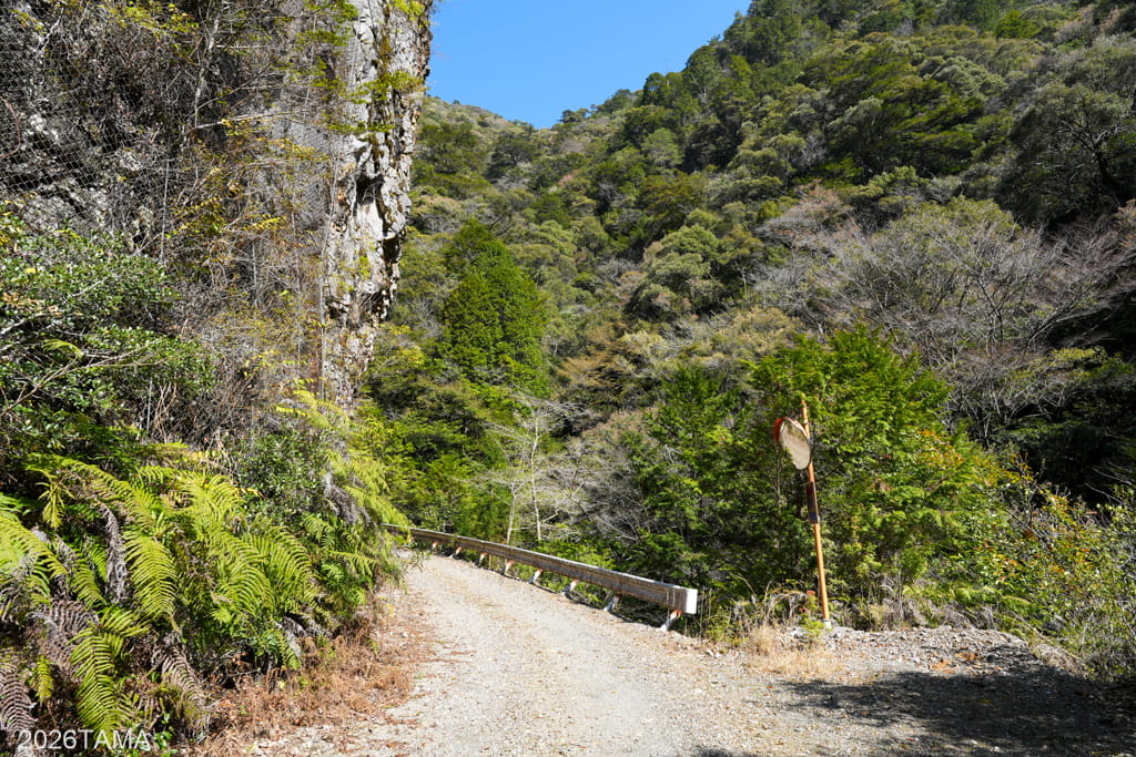また切通しについては切通しの内部にカーブミラーが設置されていて、崖沿いのカーブを車が通りやすいように工夫されています。何しろ車一台が通れるだけの平地を確保するのにも苦労する地形であり、よくこんなところに車道をつくったなと感心する。