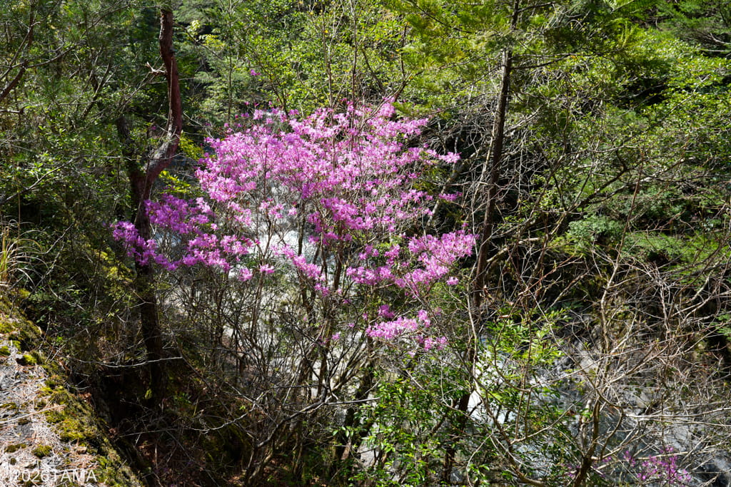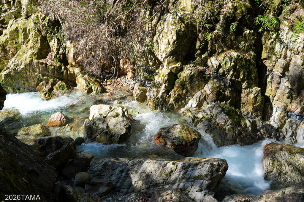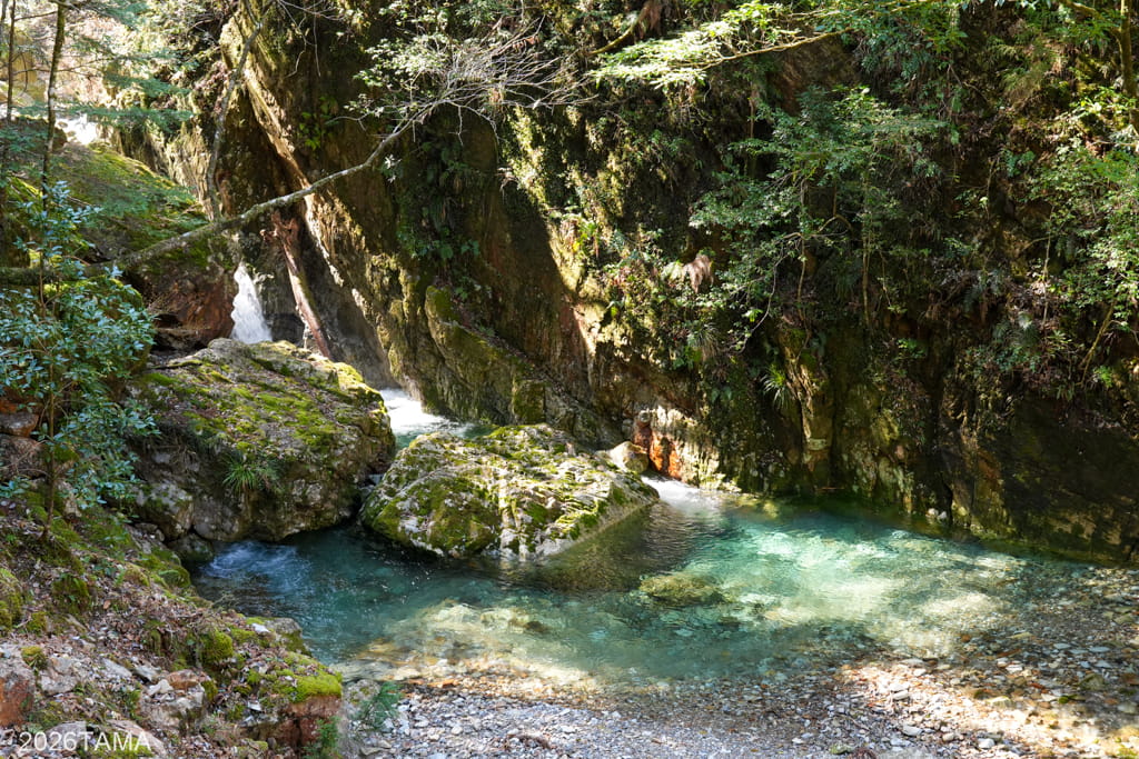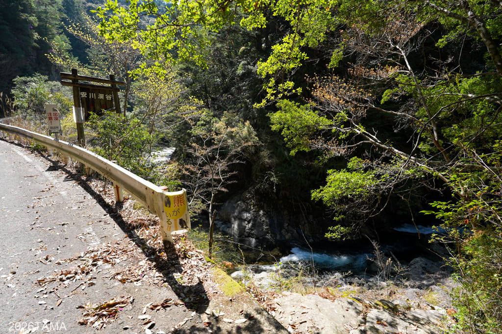 このあたりまで来ると林道と大塔川との距離がぐっと近くなり、清流の流れを間近で見ることができます。時期が時期ならここで泳ぎたいくらいだ。
