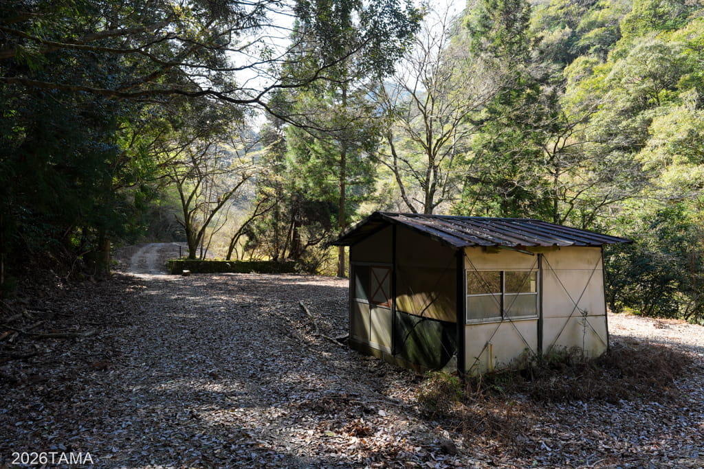 そのまま進むと川の近くに河川敷のような広い平地が広がり、途中に作業小屋のような建物がありました。