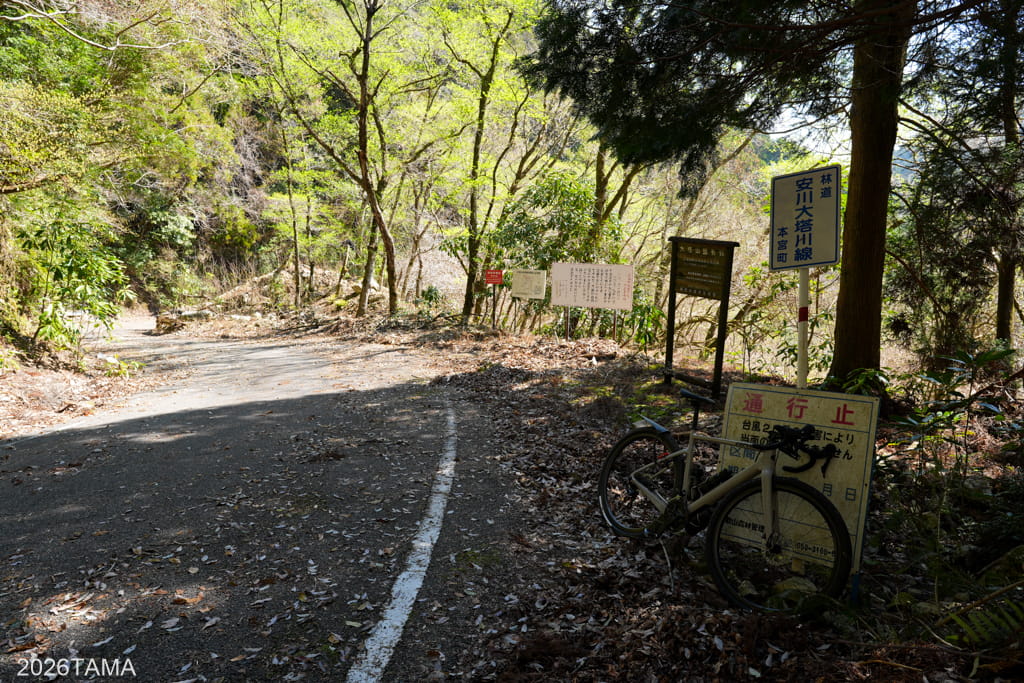 しばらく進むと県道229号方面に向かうホイホイ坂林道との分岐があり、橋をわたって右へ向かうと林道安川大塔川線へと入ります。ここからが本番というわけで気を引き締めていく。