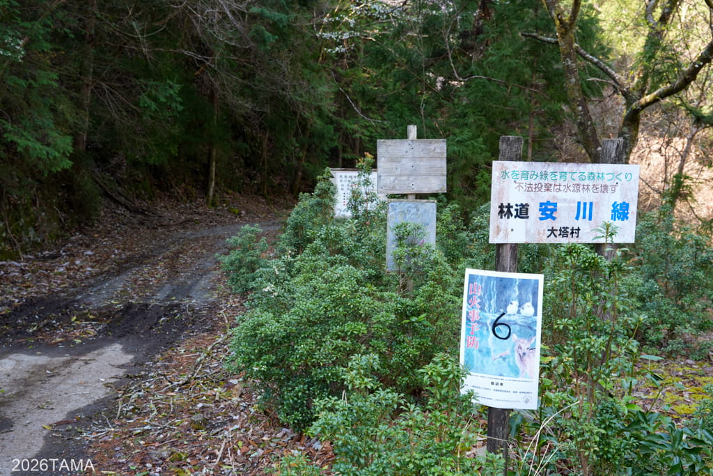 修験の滝を過ぎたあたりで「林道安川線」という未舗装の林道がありましたが、これは安川の上流方面に向かう行き止まりの道のようでした。